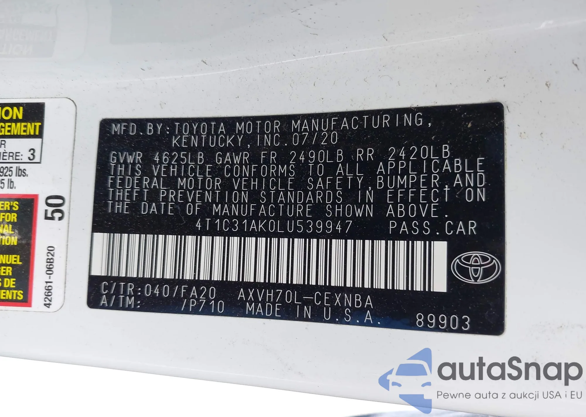 LOT: 42083565 VIN: 4T1C31AK0LU539947