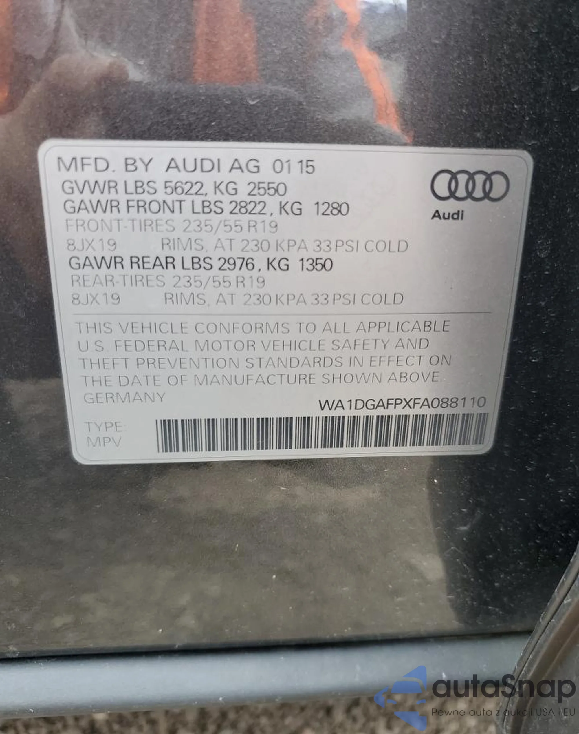 LOT: 54851055 VIN: WA1DGAFPXFA088110