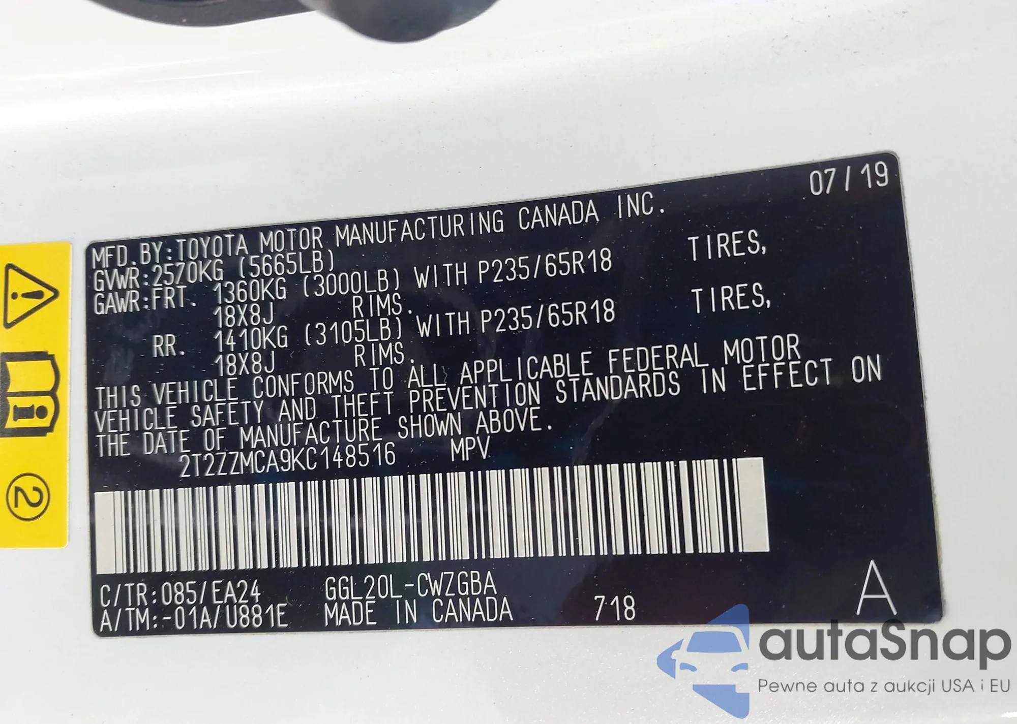 • VIN 2T2ZZMCA9KC148516