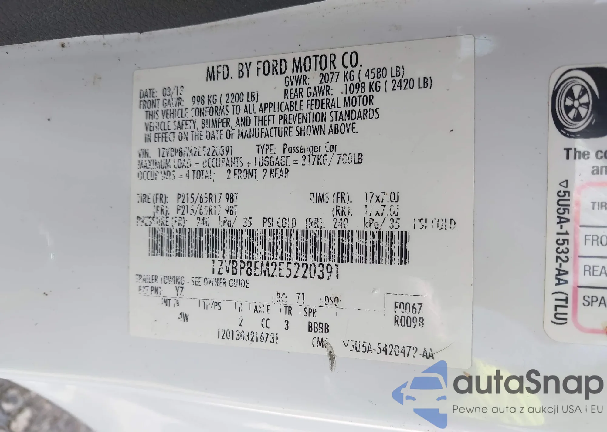 LOT: 42160616 VIN: 1ZVBP8EM2E5220391