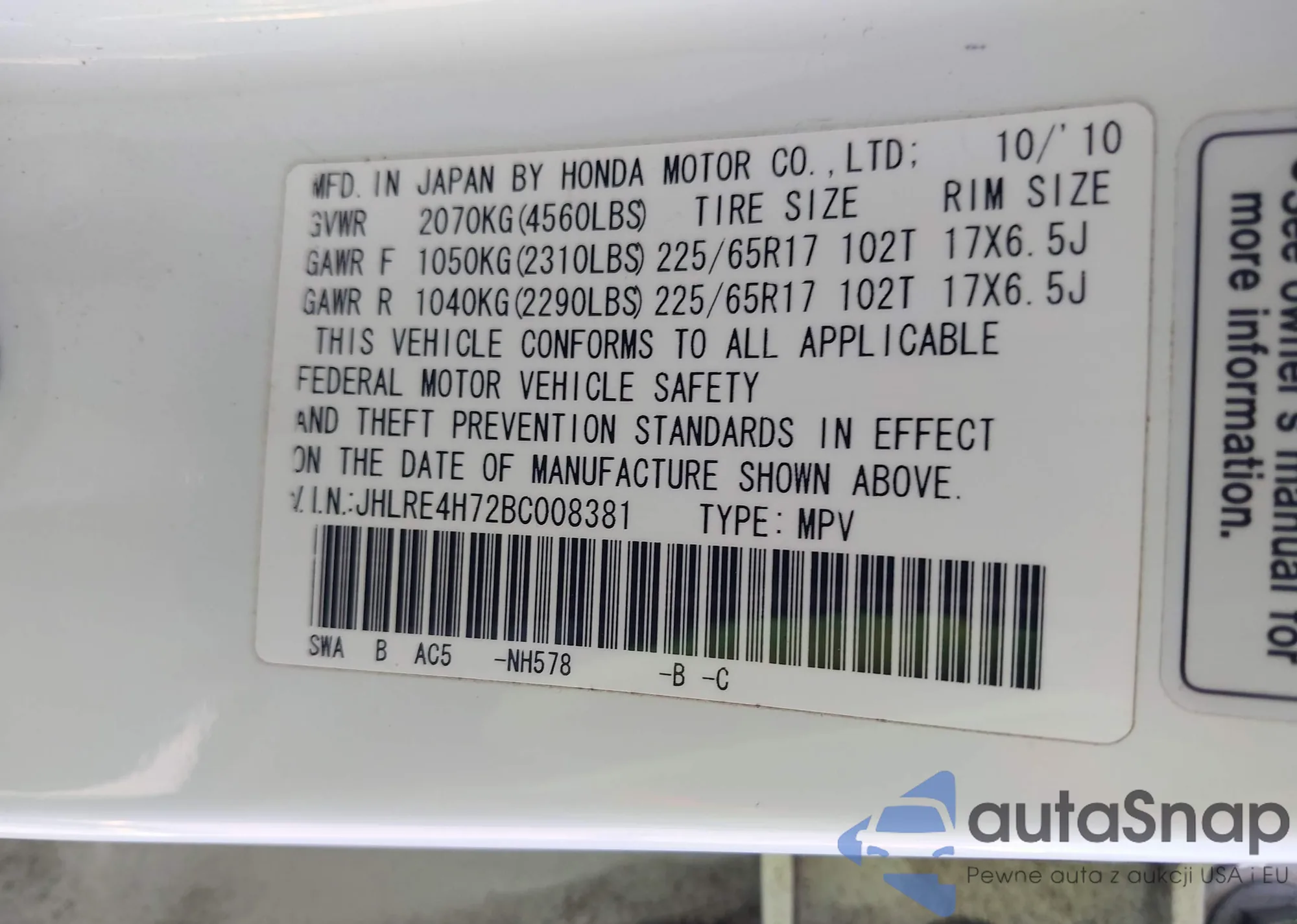 • VIN 5J6RM4H4XGL037019