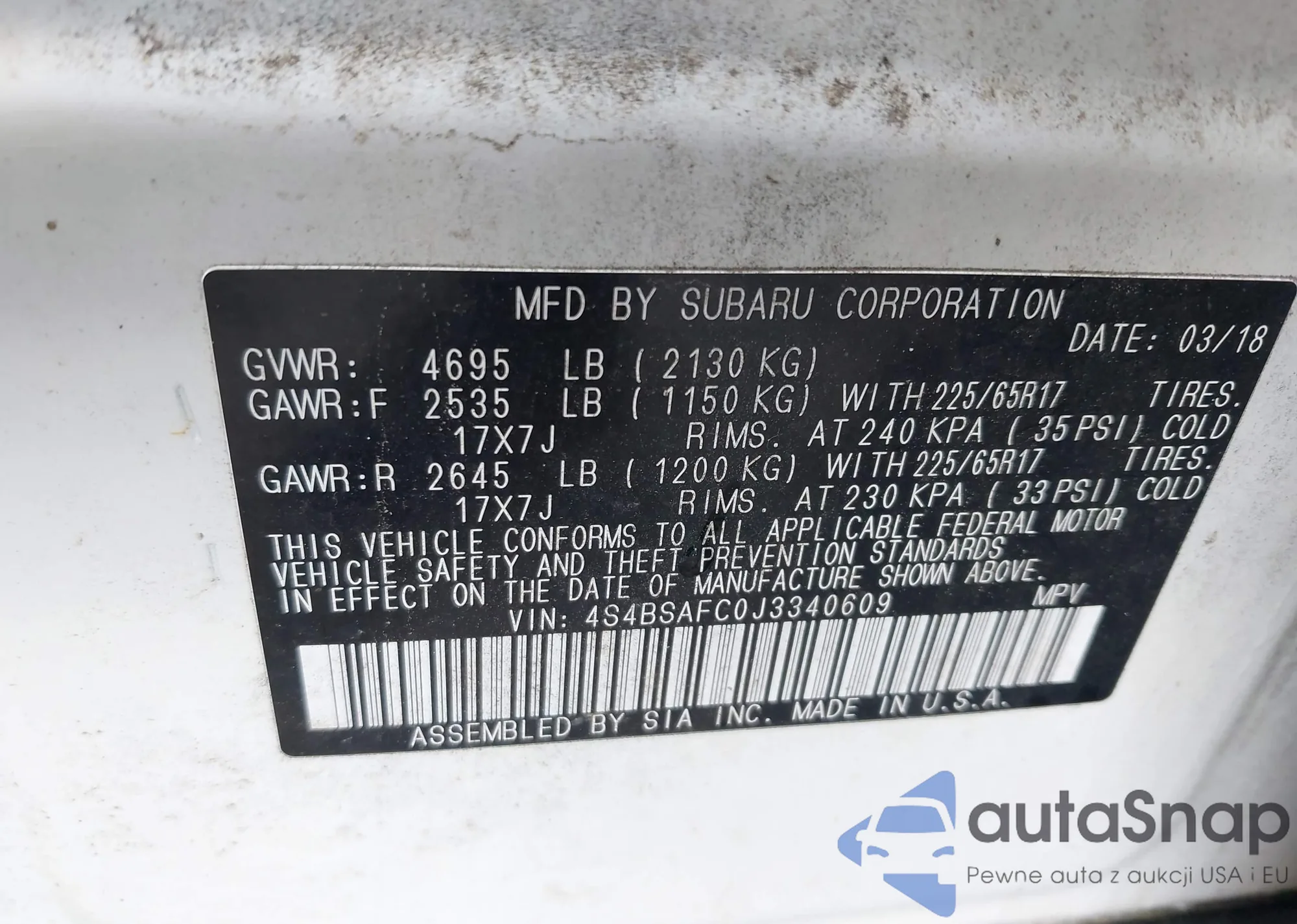 LOT: 42180606 VIN: 4S4BSAFC0J3340609