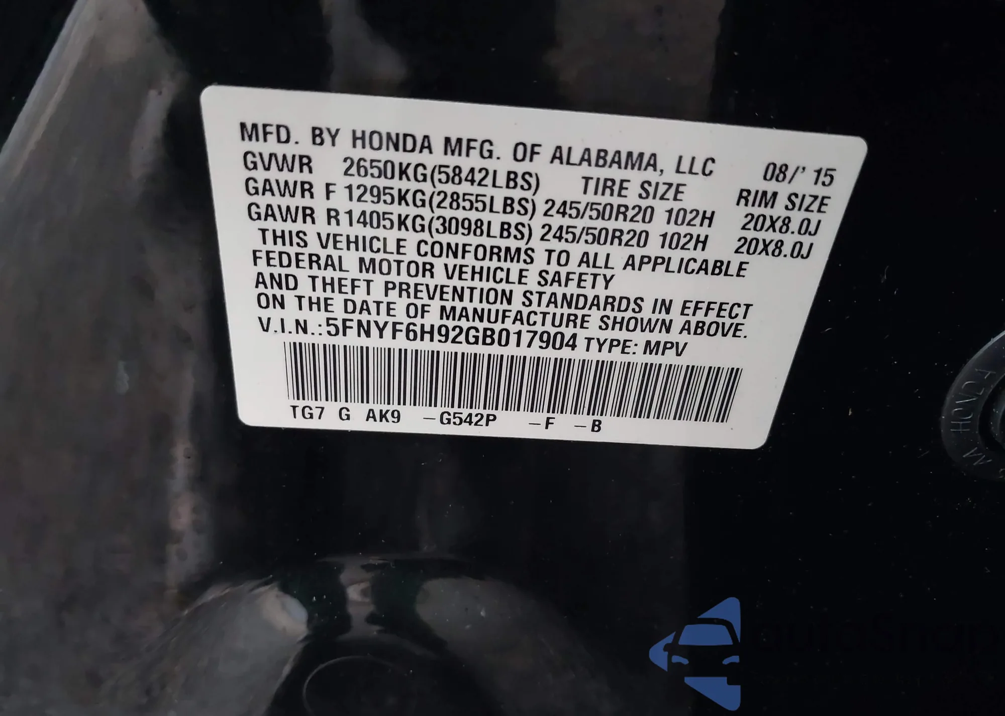 • VIN 5FNYF6H81NB062109