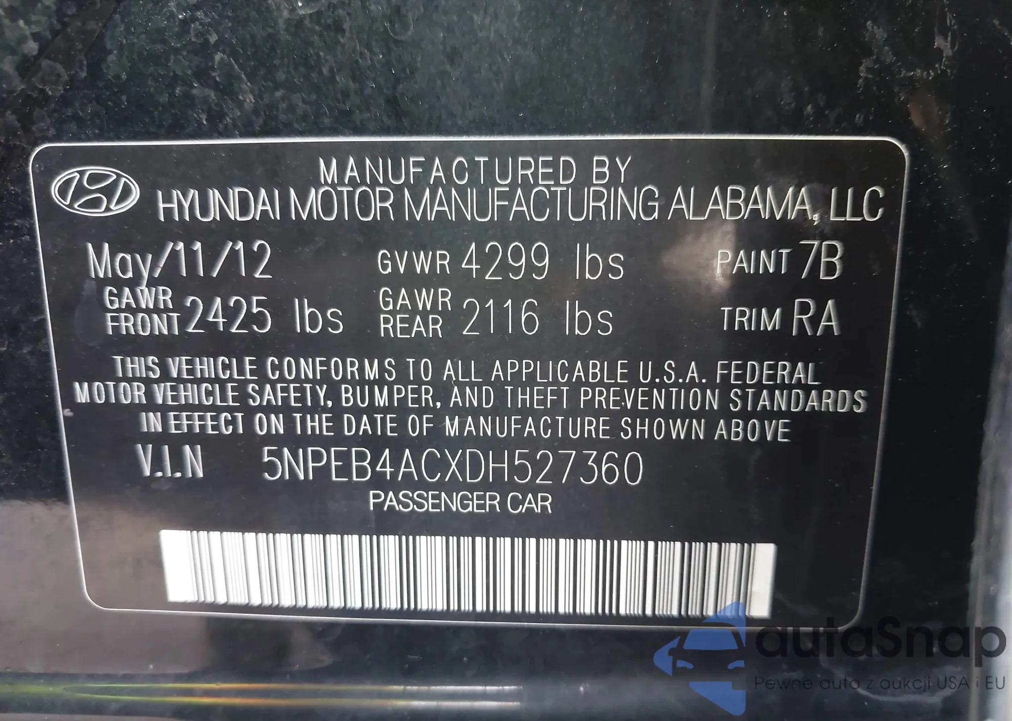 • VIN 5NPEB4ACXDH527360