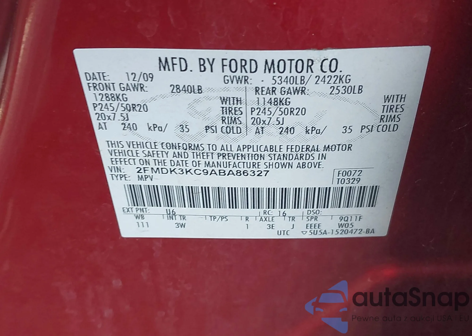 LOT: 42117319 VIN: 2FMDK3KC9ABA86327