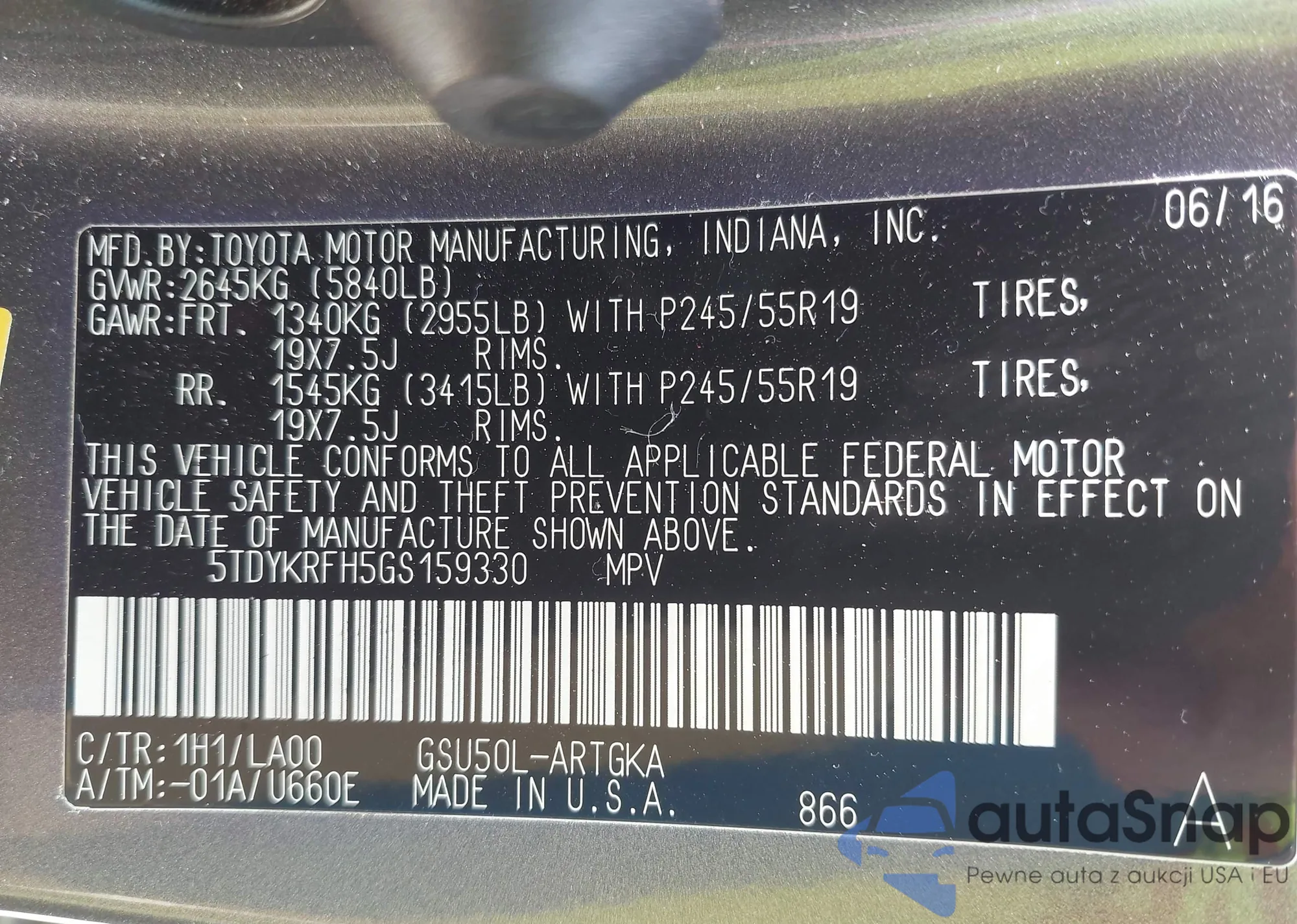 LOT: 42159720 VIN: 5TDYKRFH5GS159330