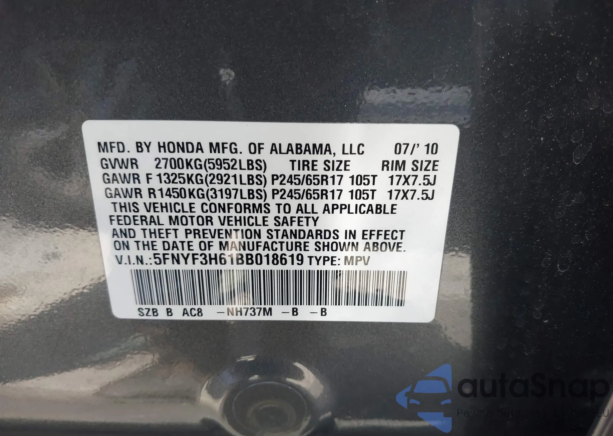 • VIN 5FNYF3H61BB018619