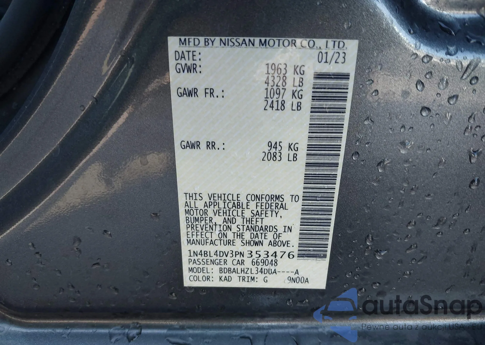 LOT: 42259077 VIN: 1N4BL4DV3PN353476