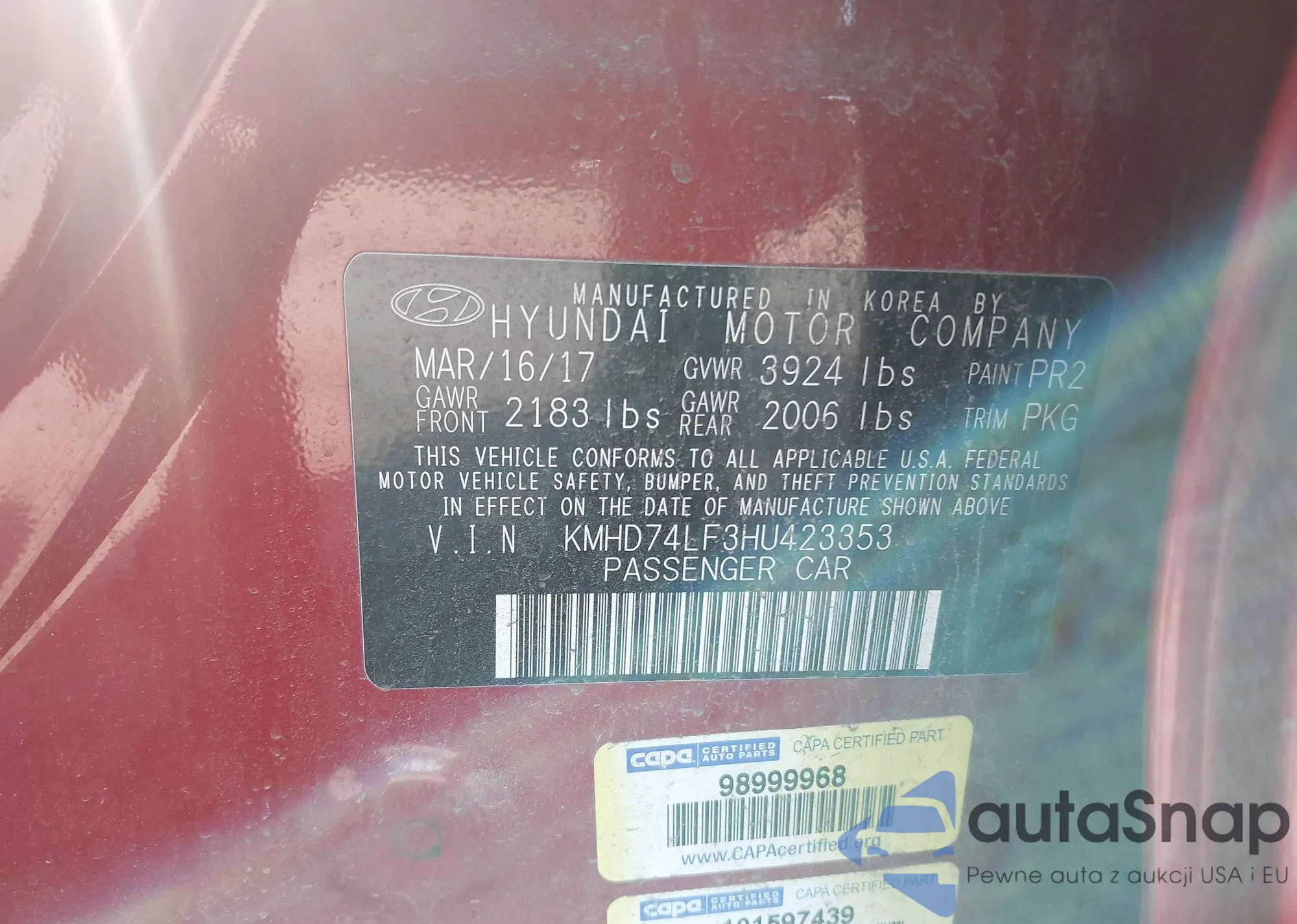 LOT: 42296946 VIN: KMHD74LF3HU423353