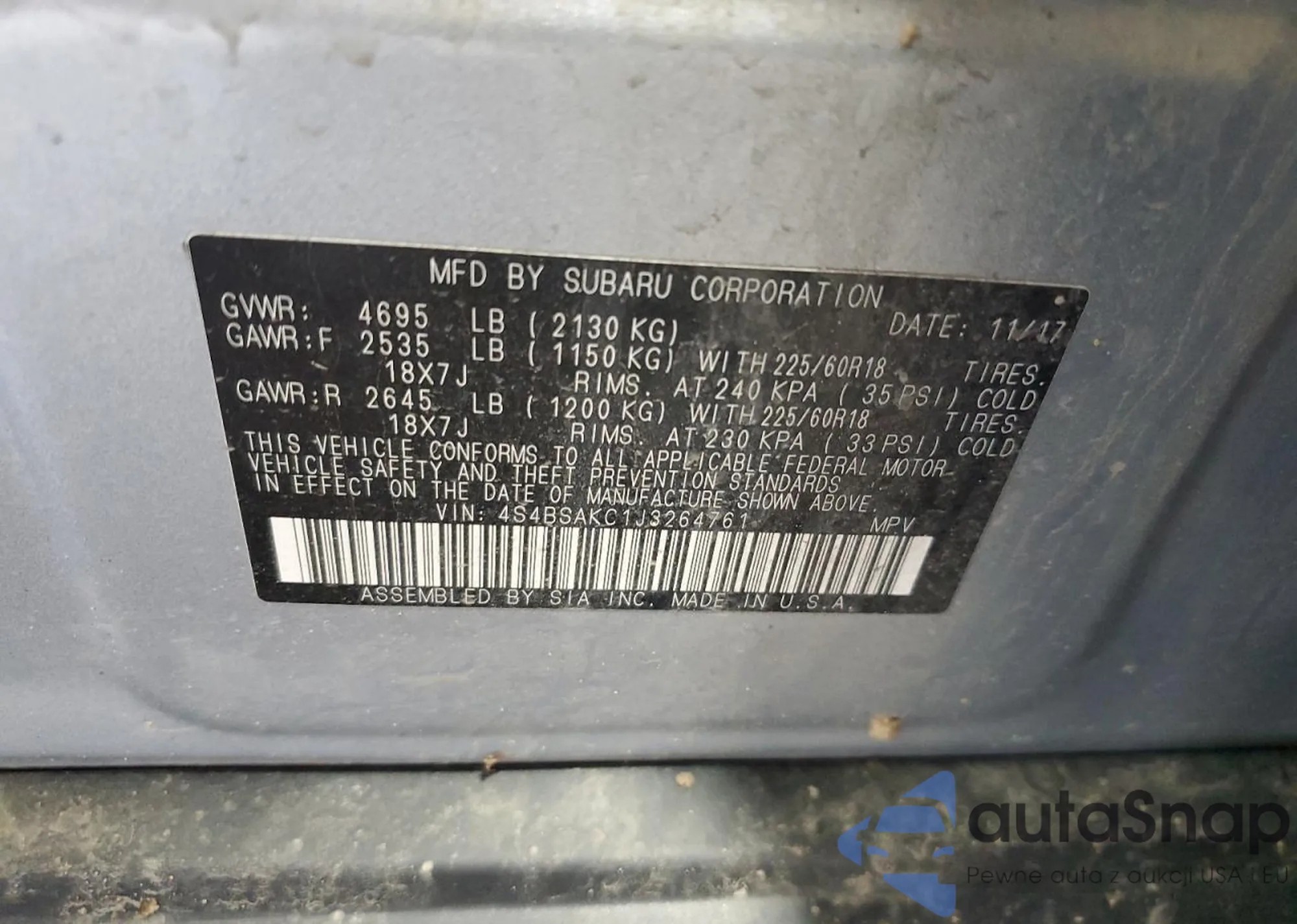 • VIN 4S4BSAKC1J3264761