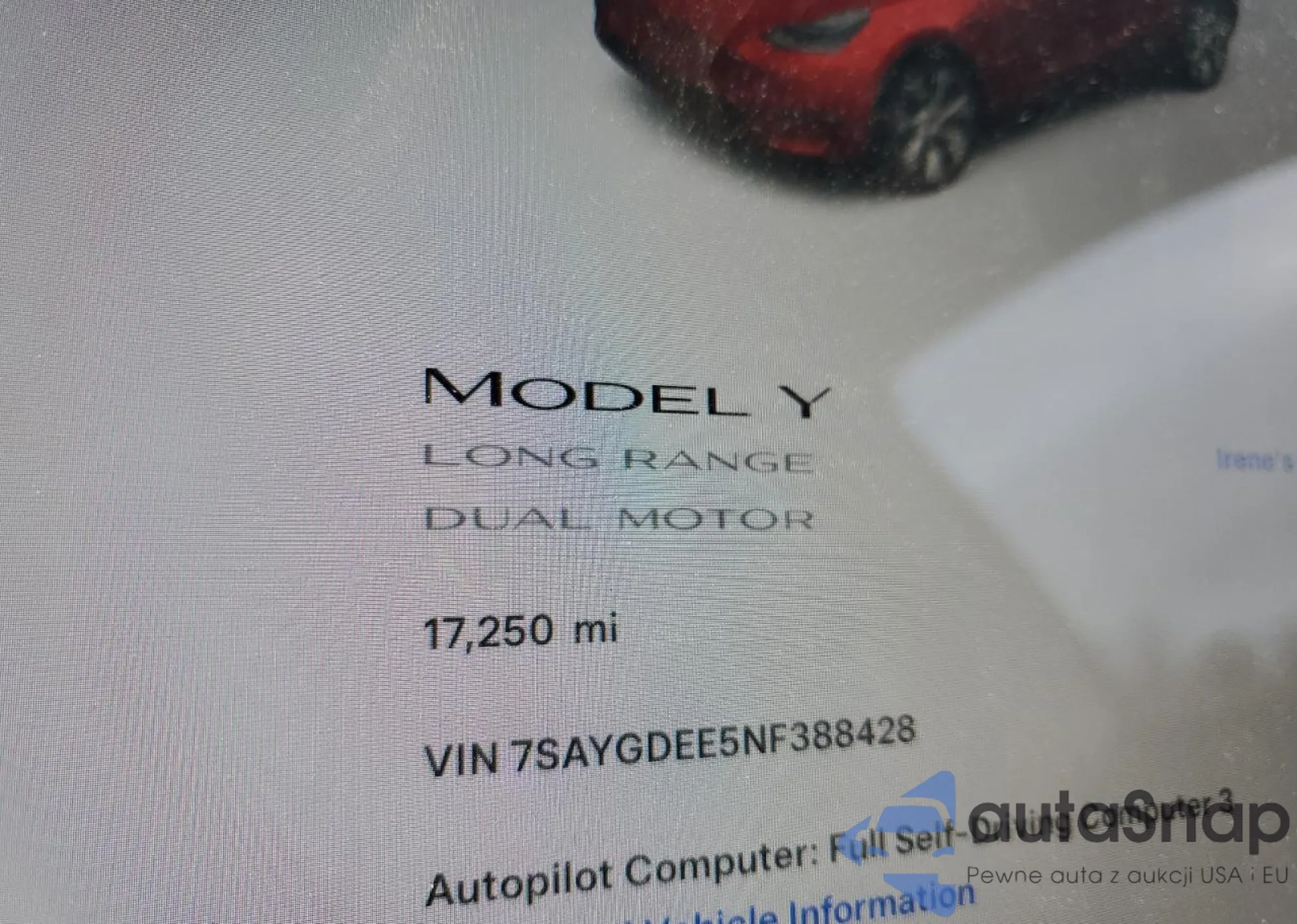 2022 Tesla Model Y z USA, uszkodzony, nr VIN 7SAYGDEE5NF388428