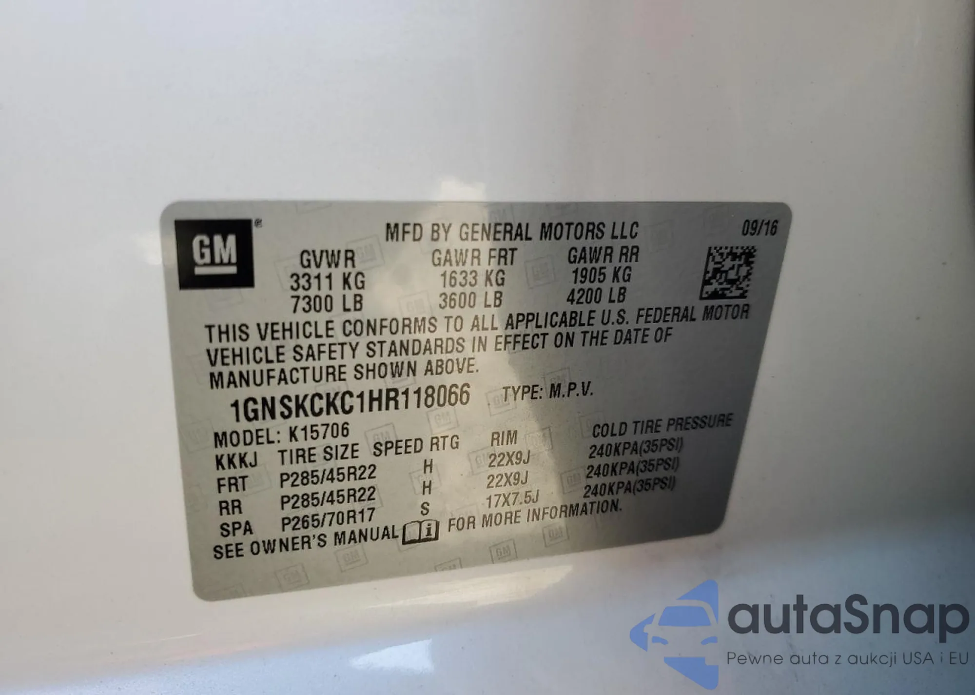 LOT: 46673505 VIN: 1GNSKCKC1HR118066