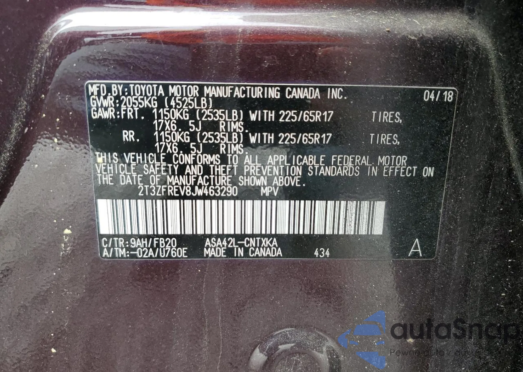 • VIN 2T3ZFREV8JW463290