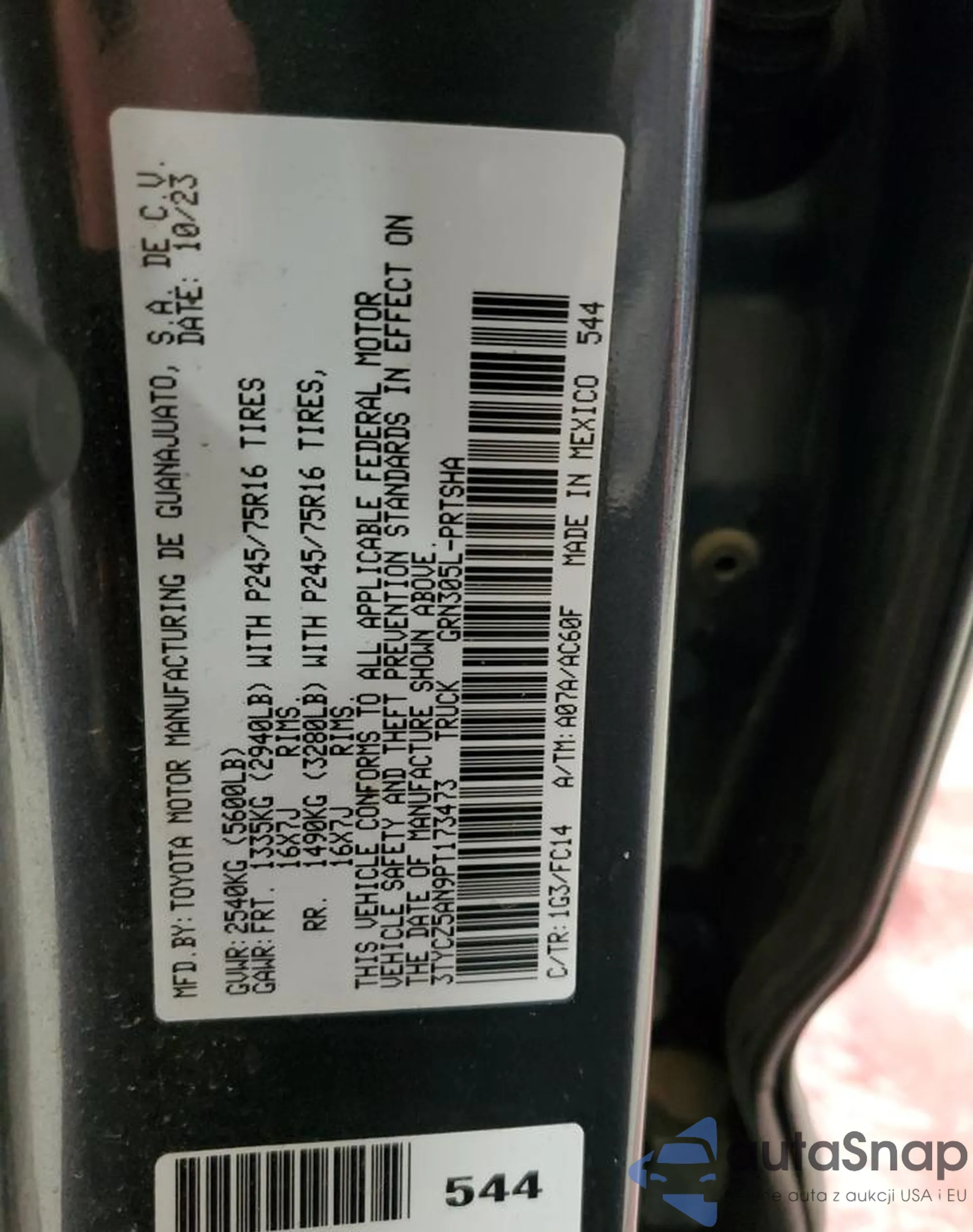LOT: 54219015 VIN: 3TYCZ5AN9PT173473