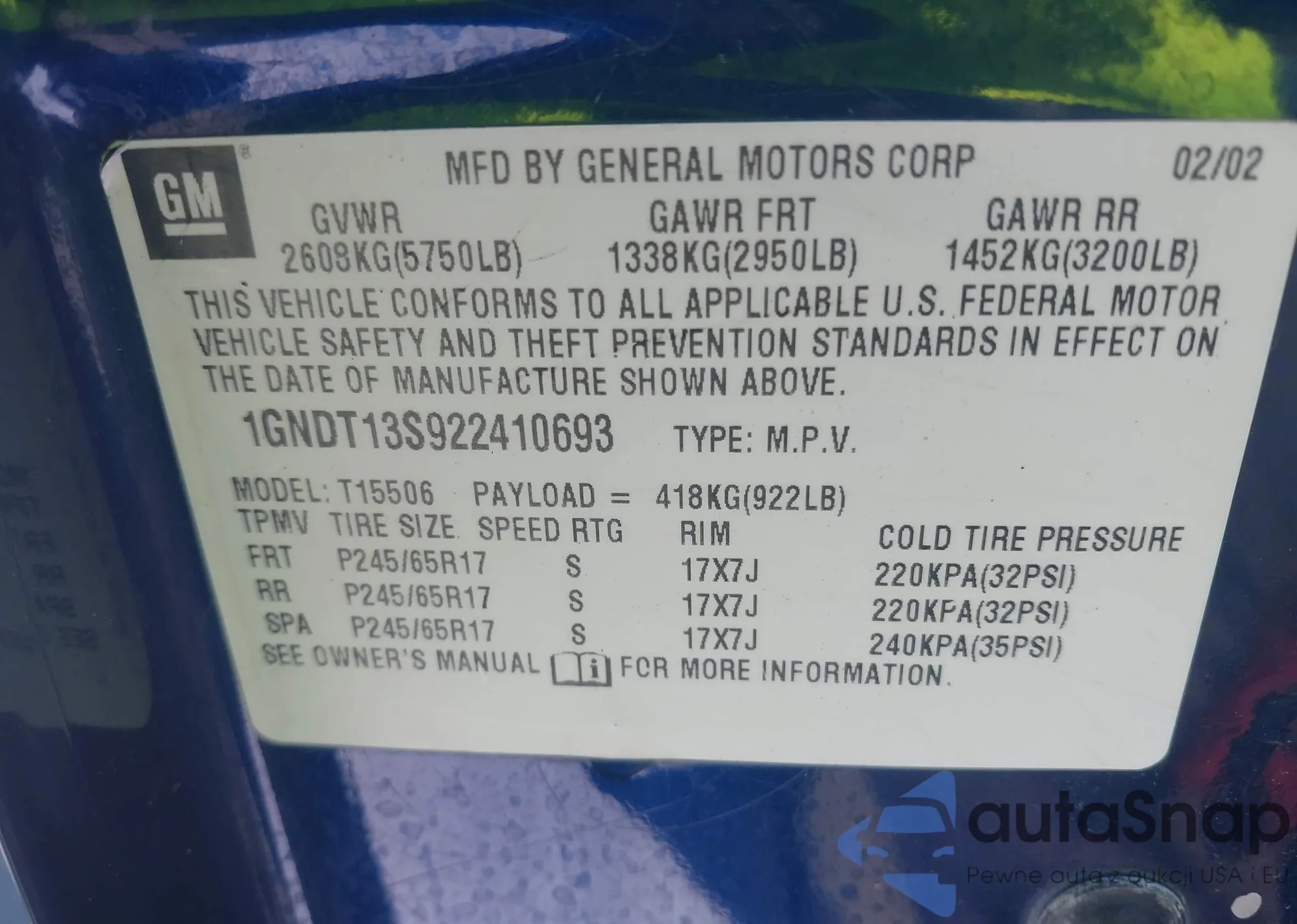 • VIN 1GNDT13S922410693