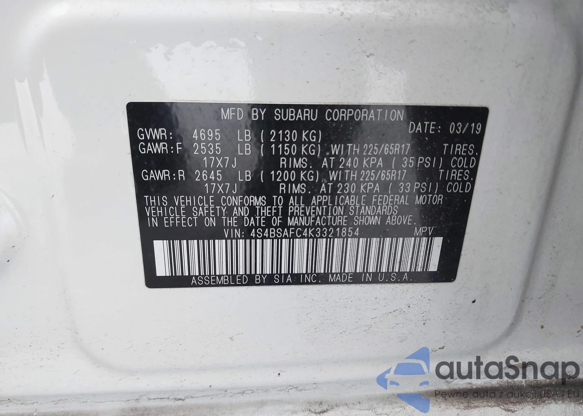 • VIN 4S4BSAFC4K3321854