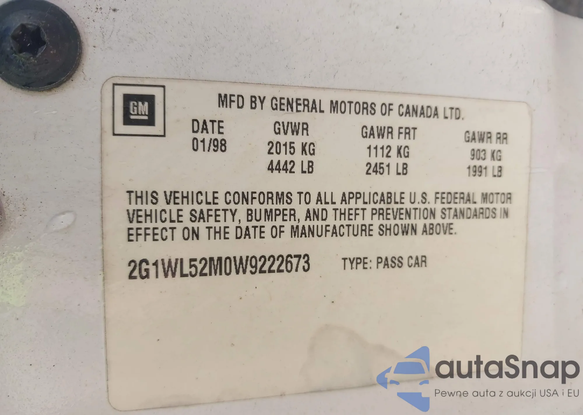 • VIN 2G1WL52M0W9222673