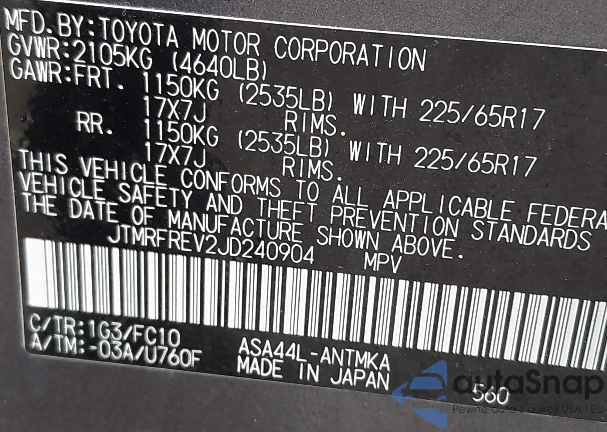 LOT: 42110896 VIN: NMTKHMBX3JR024079