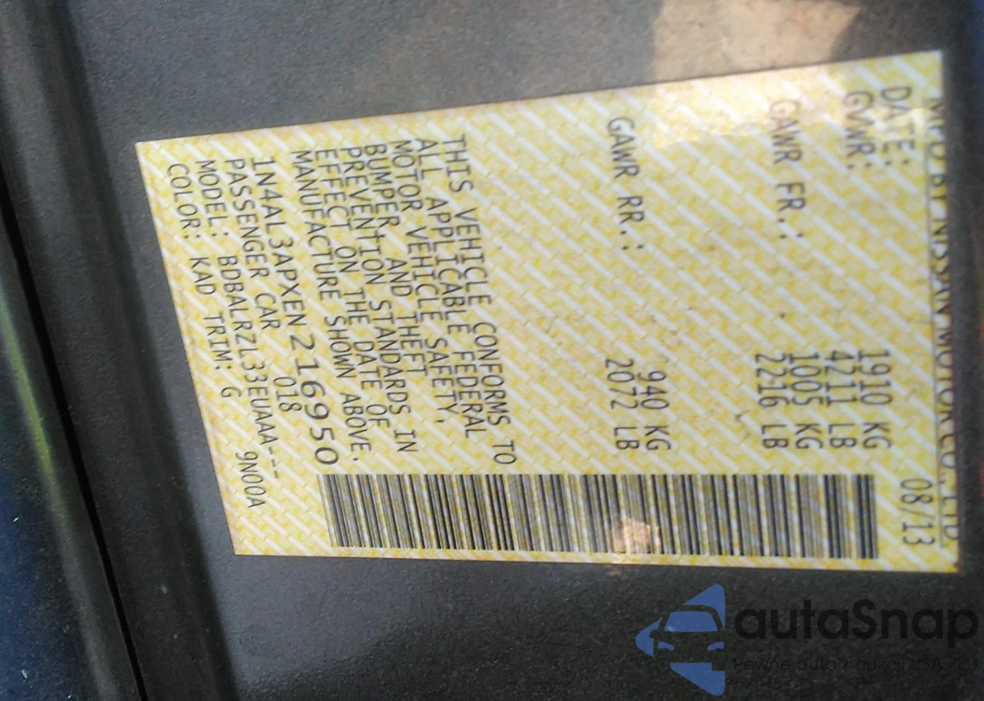 LOT: 42169002 VIN: 1N4AL3APXEN216950