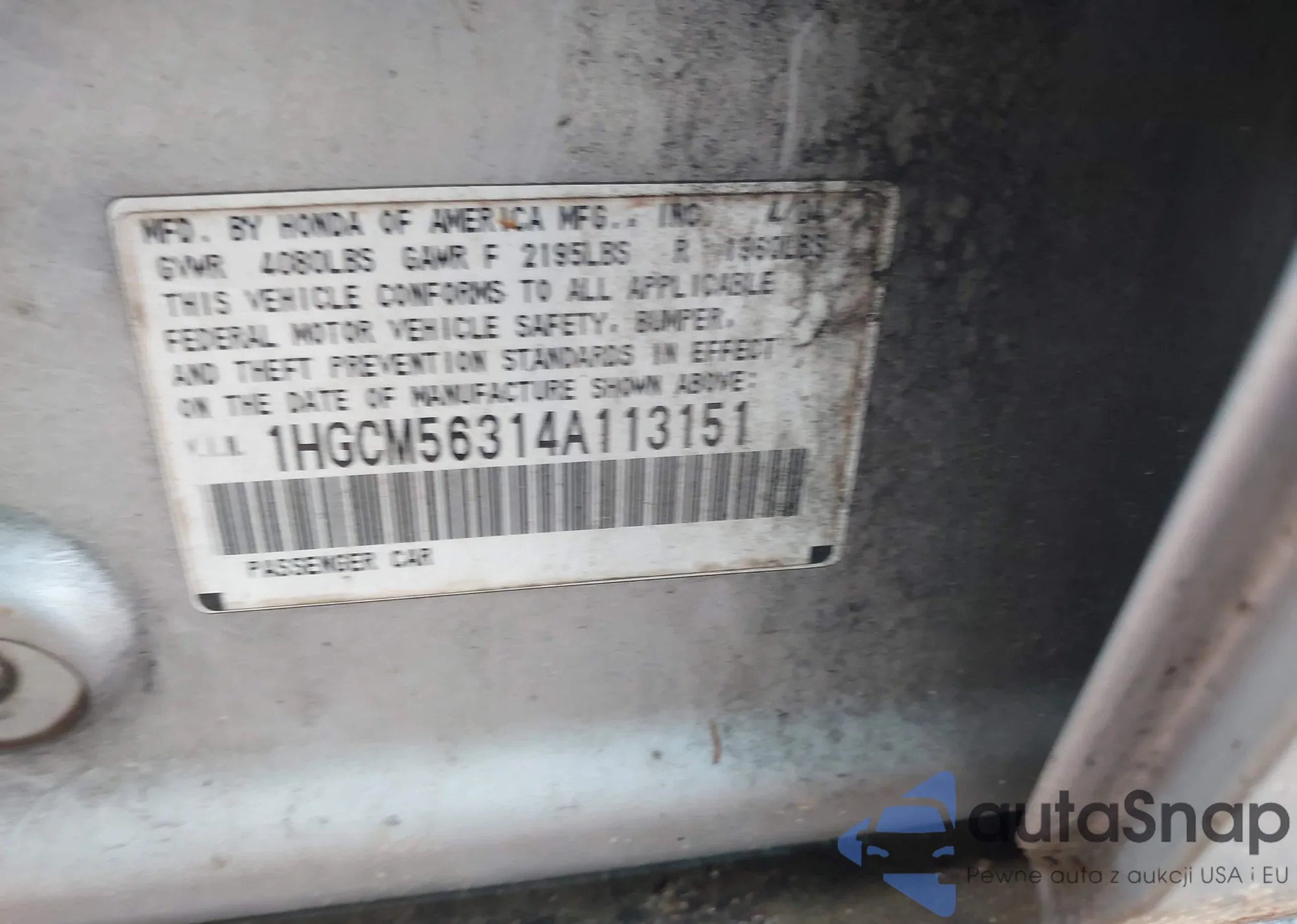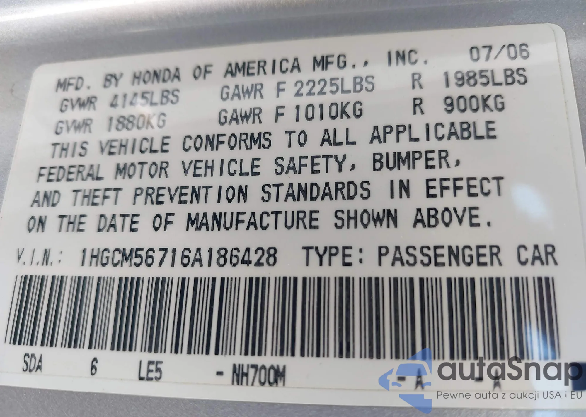 LOT: 42228830 VIN: 1HGCM56716A186428