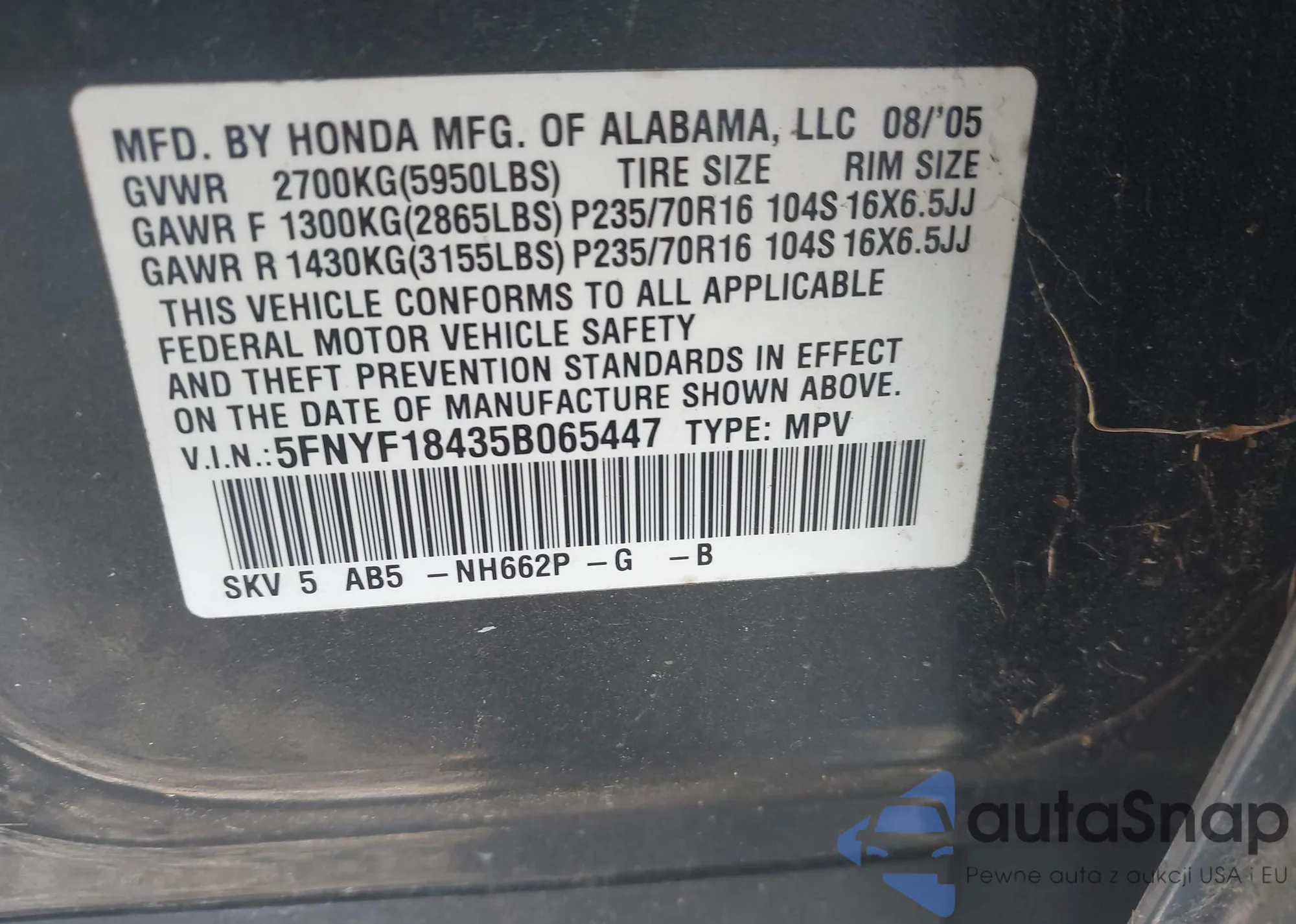 LOT: 42316766 VIN: 5FNYF18435B065447