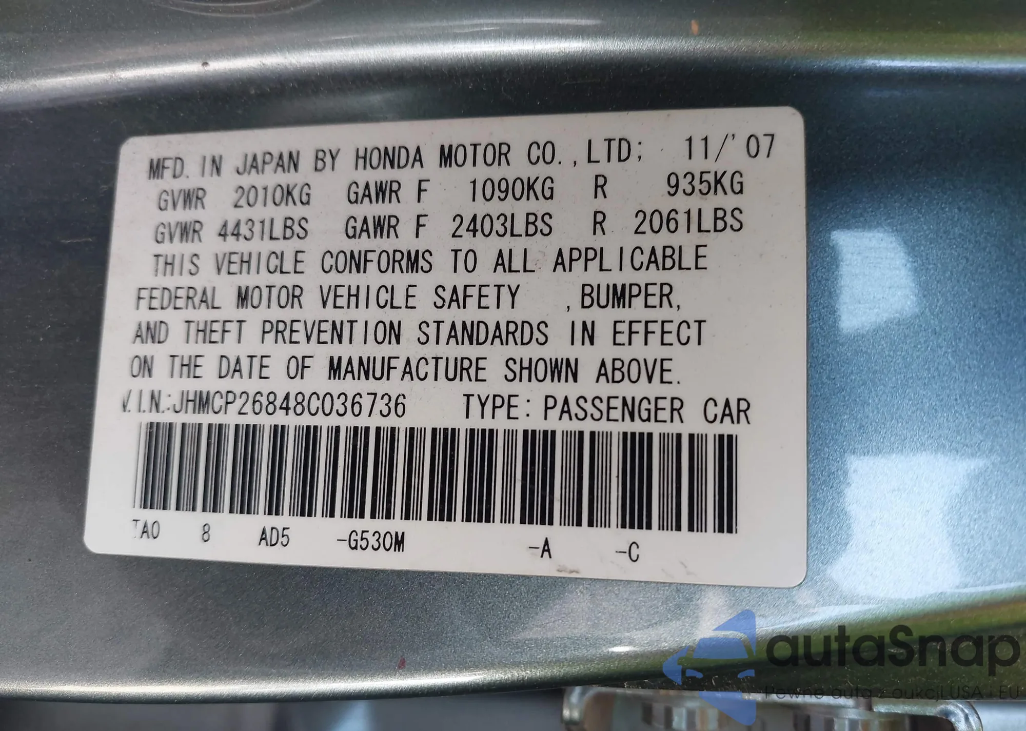• VIN 5FNYF6H03NB085997