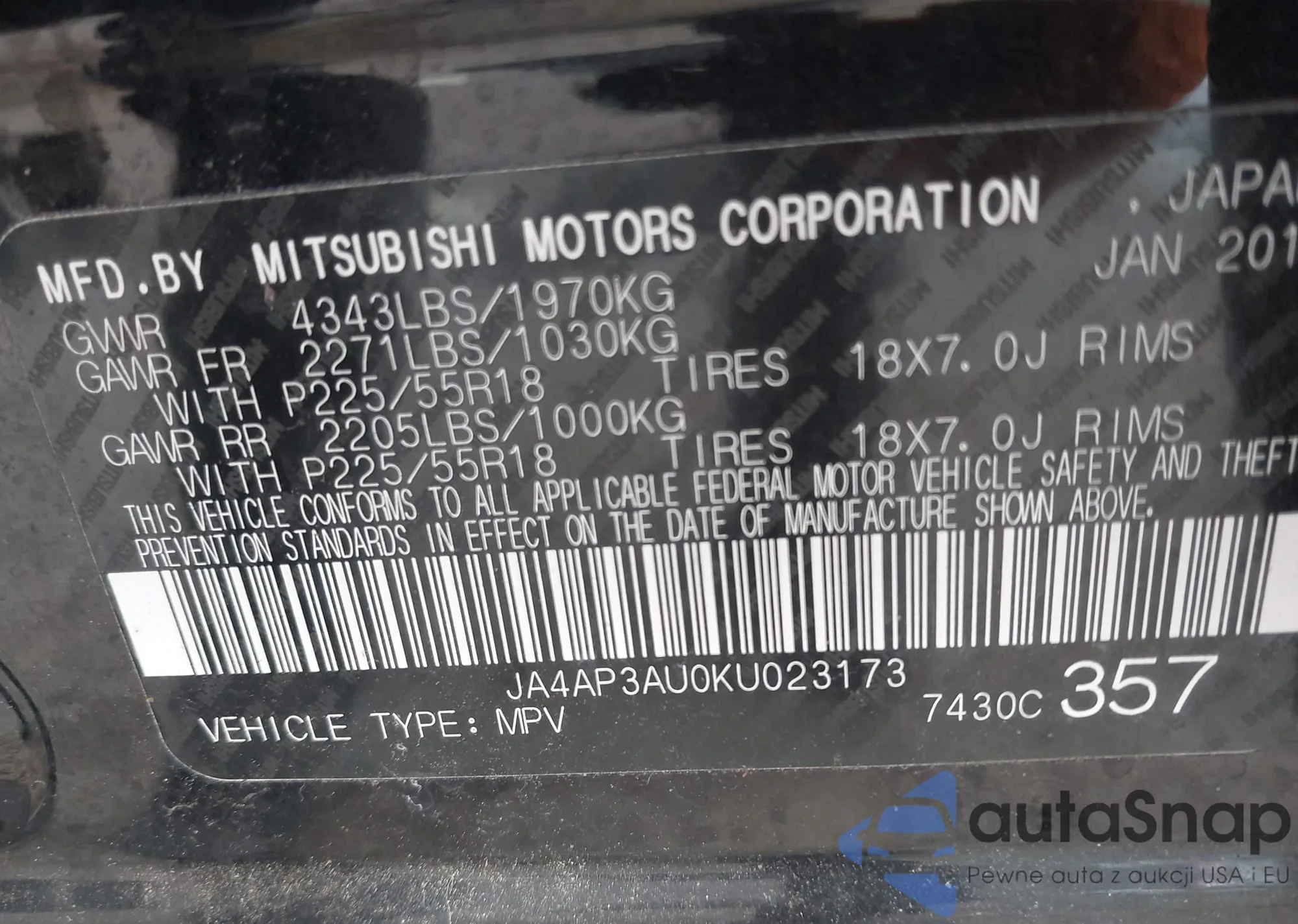 LOT: 41812441 VIN: JA4AP3AU0KU023173