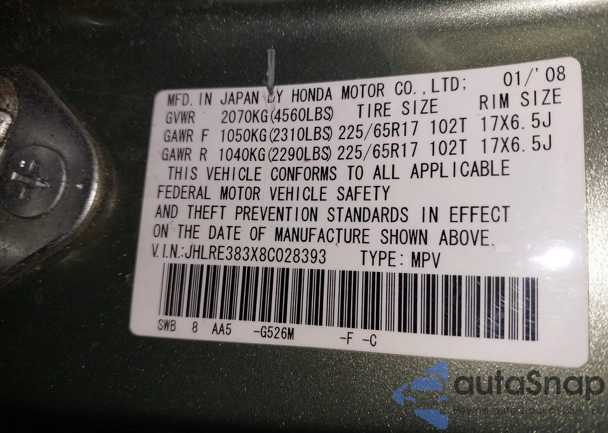 LOT: 42293965 VIN: JHLRE383X8C028393