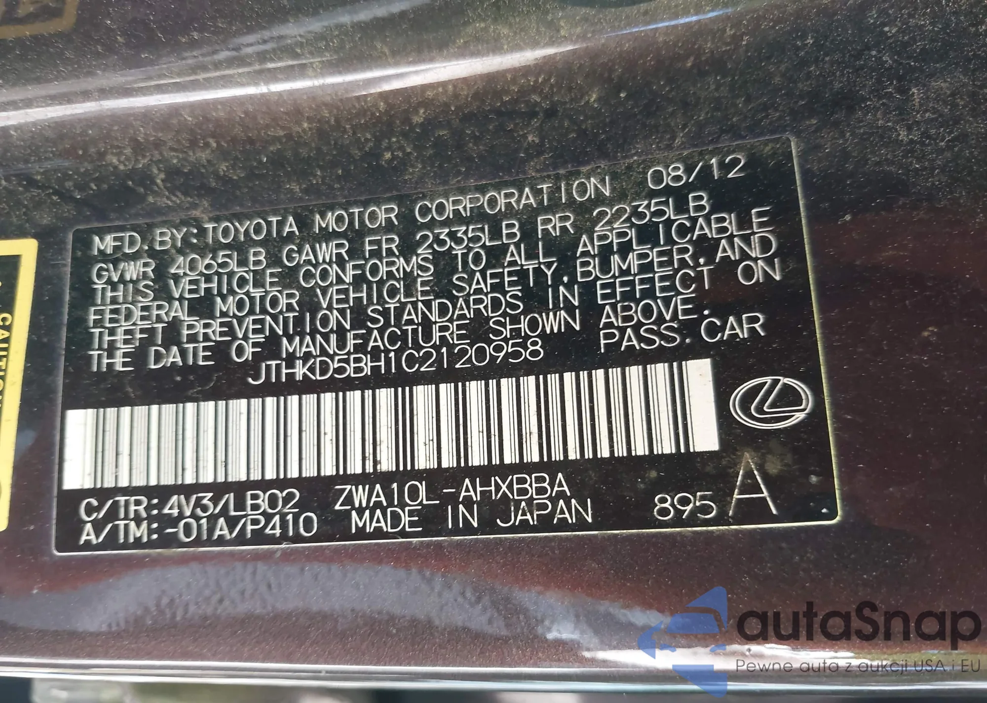 • VIN JTHKD5BH1C2120958