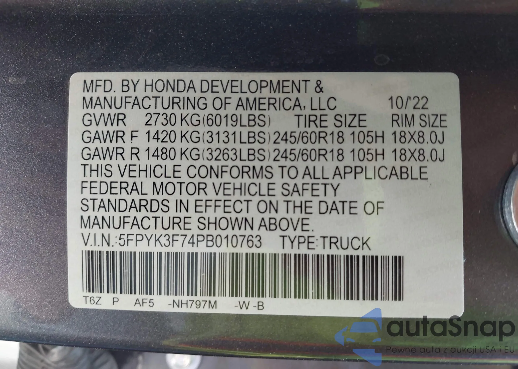 • VIN 5FPYK3F74PB010763