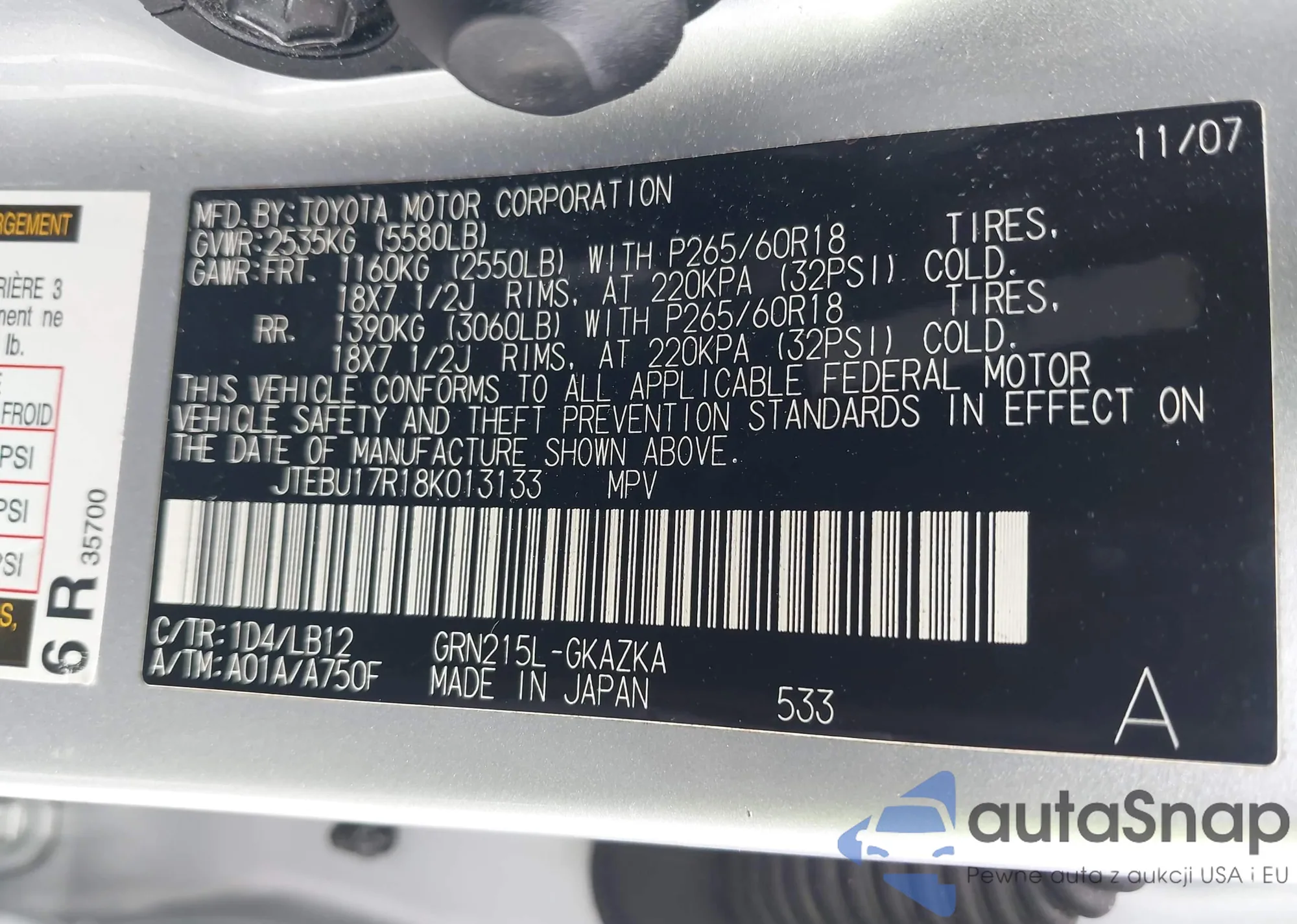 LOT: 42305309 VIN: JTDKB20U777603255