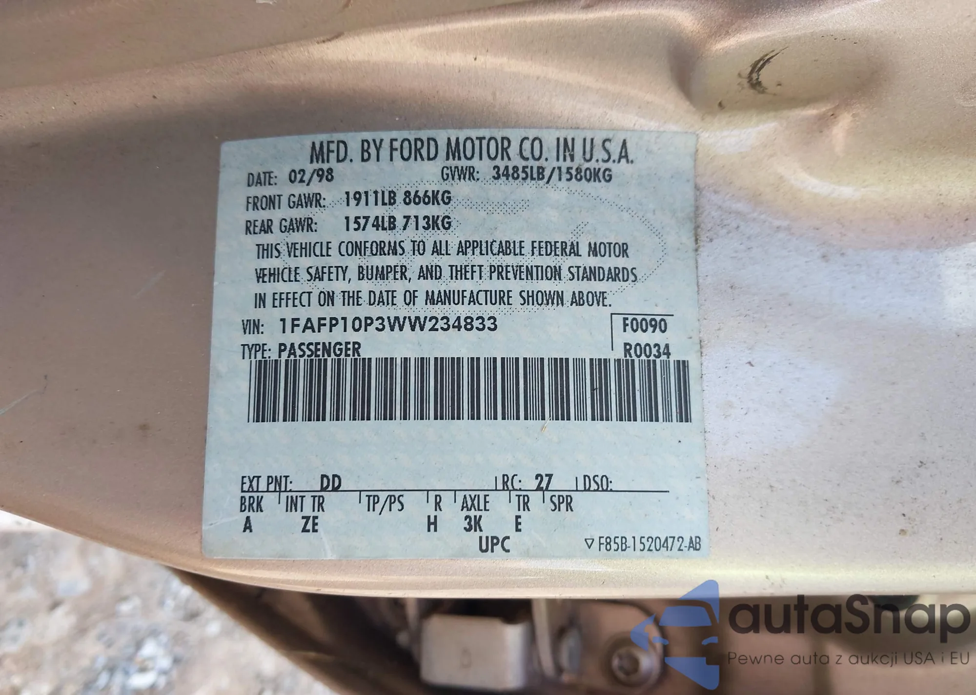 LOT: 42316400 VIN: 1FAFP10P3WW234833