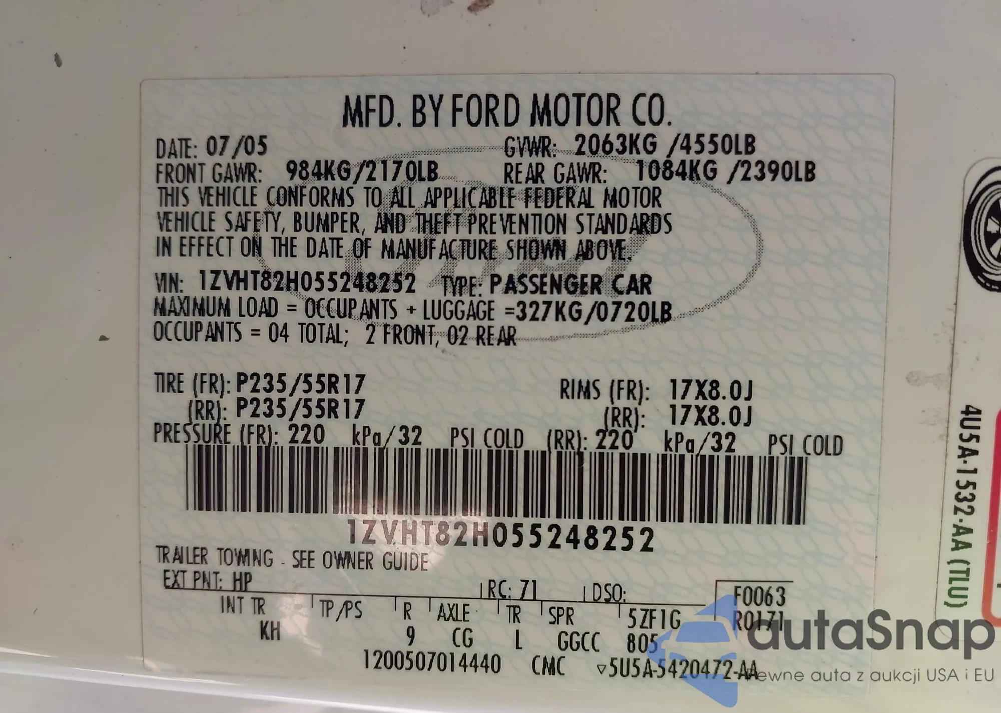 LOT: 42319597 VIN: 1ZVHT82H055248252