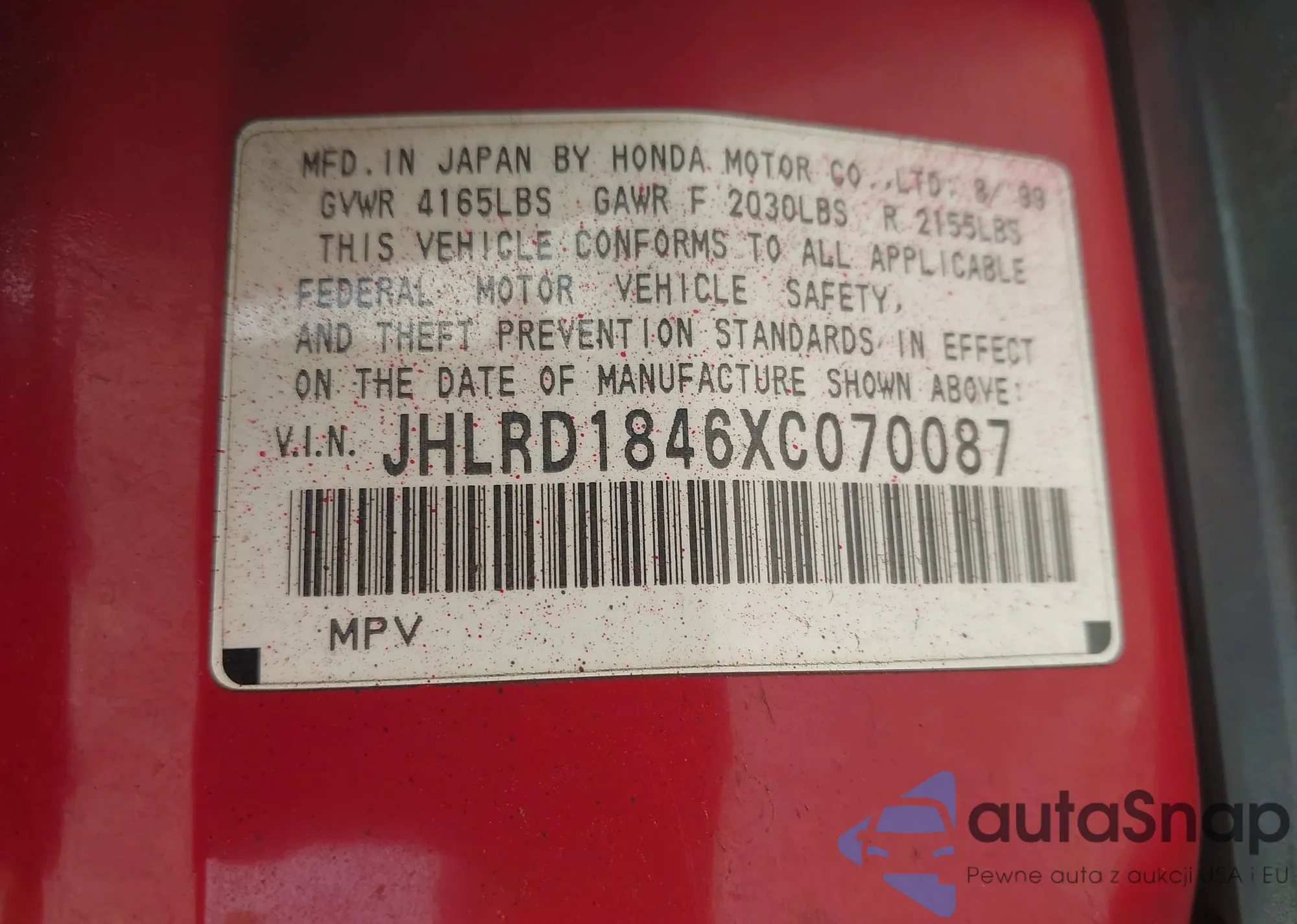LOT: 42321054 VIN: JHLRD1846XC070087