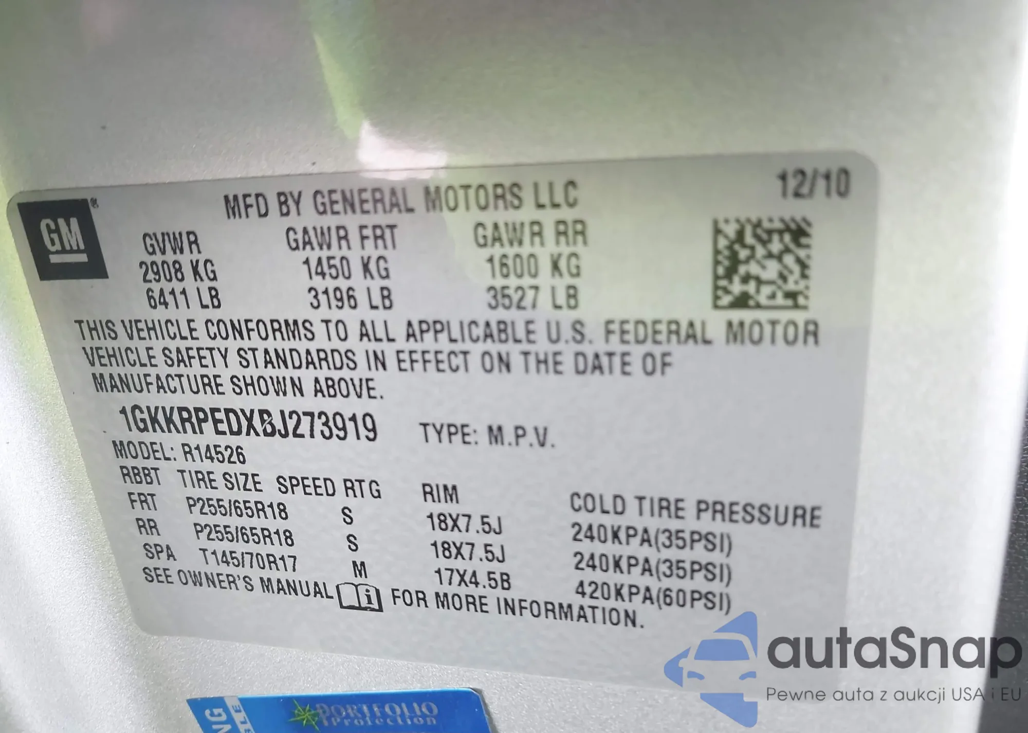 • VIN 1GKKRPEDXBJ273919