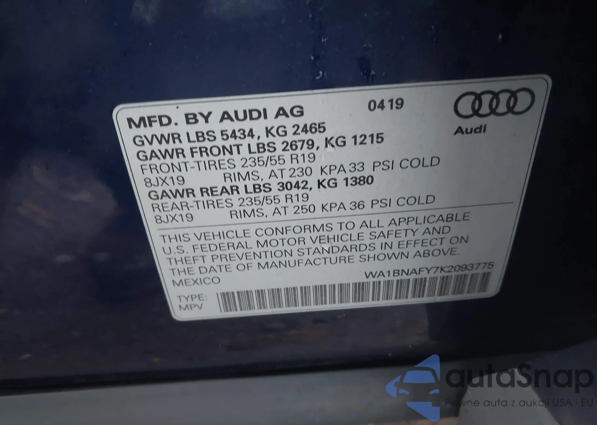 LOT: 42149721 VIN: WBAEK13507CN80479