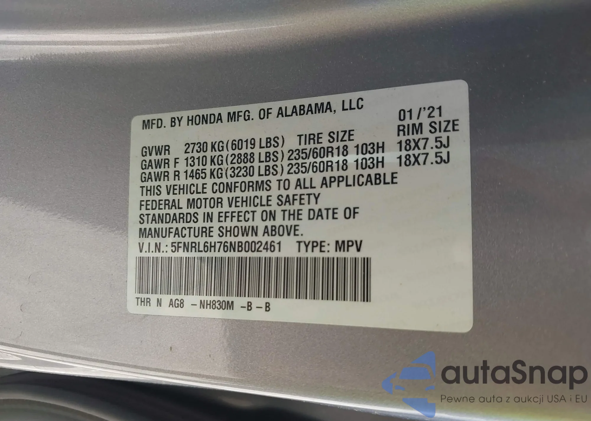 • VIN 5FNRL6H76NB002461