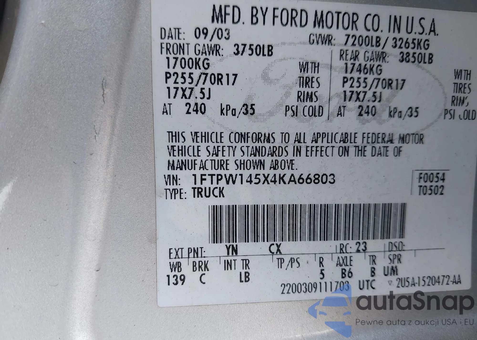 • VIN 1FTPW145X4KA66803