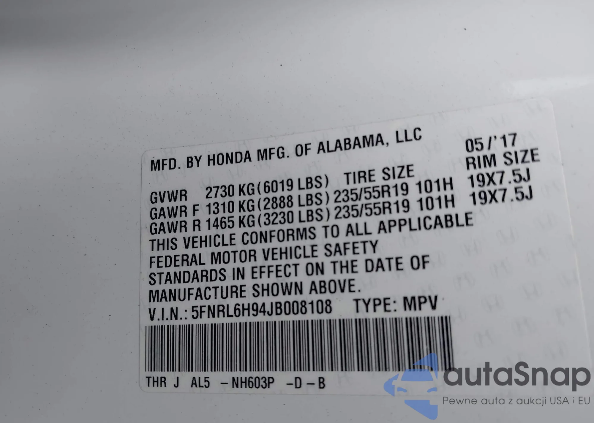 • VIN 5FNRL6H94JB008108
