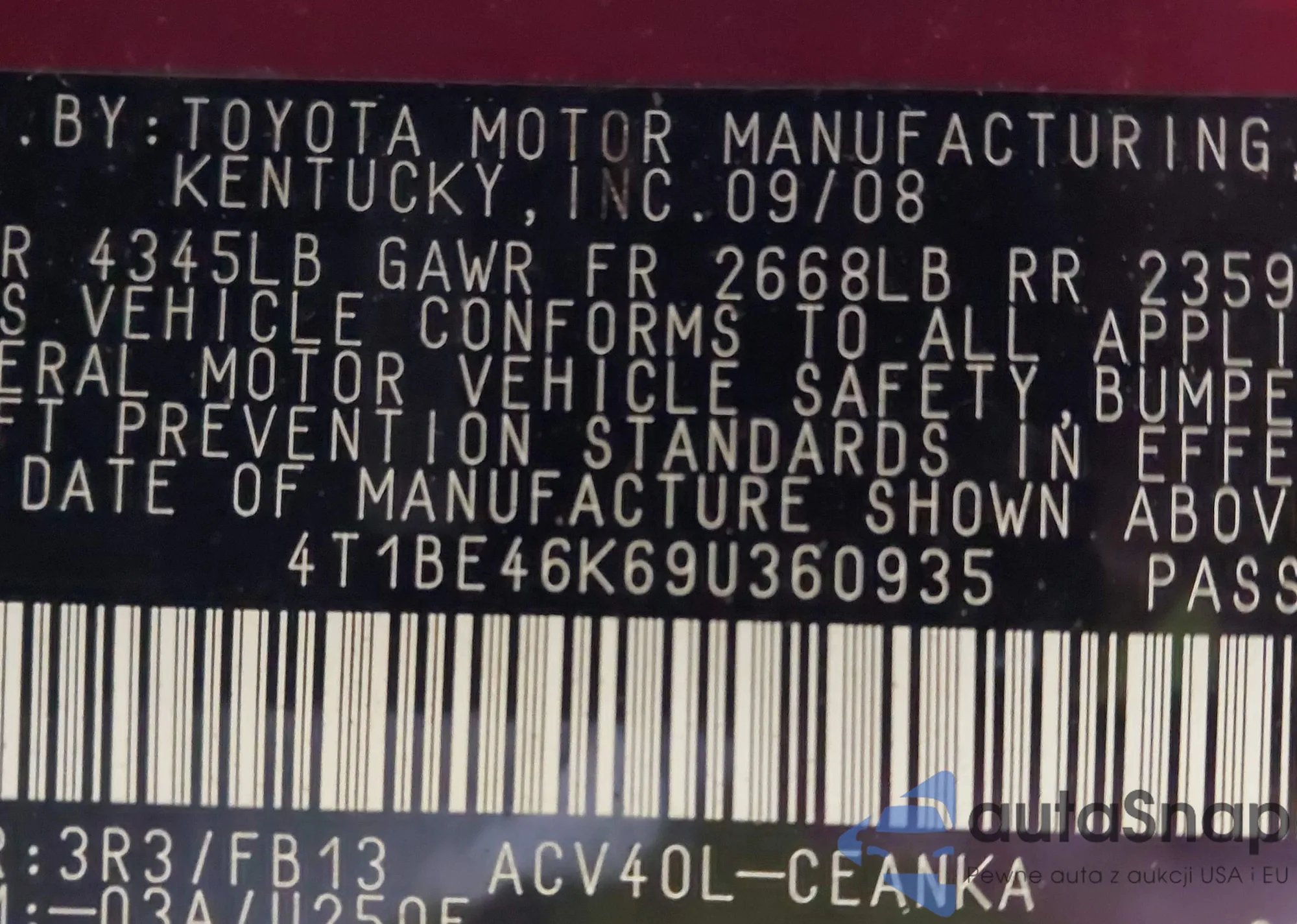 LOT: 42231935 VIN: 4T1BE46K69U360935