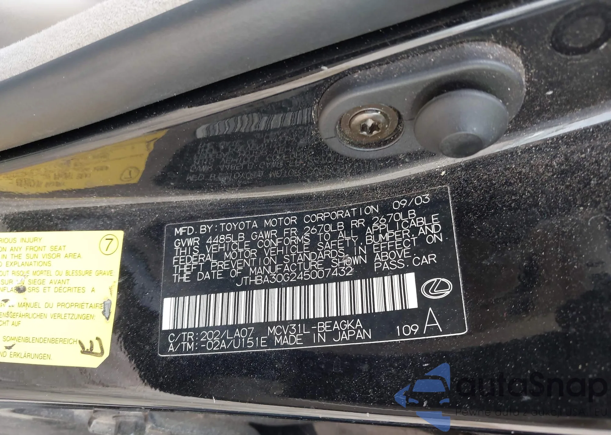 LOT: 42233147 VIN: JTHBA30G245007432