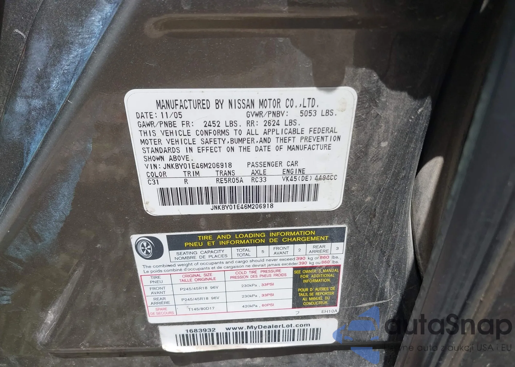 LOT: 42269887 VIN: JNKBY01E46M206918