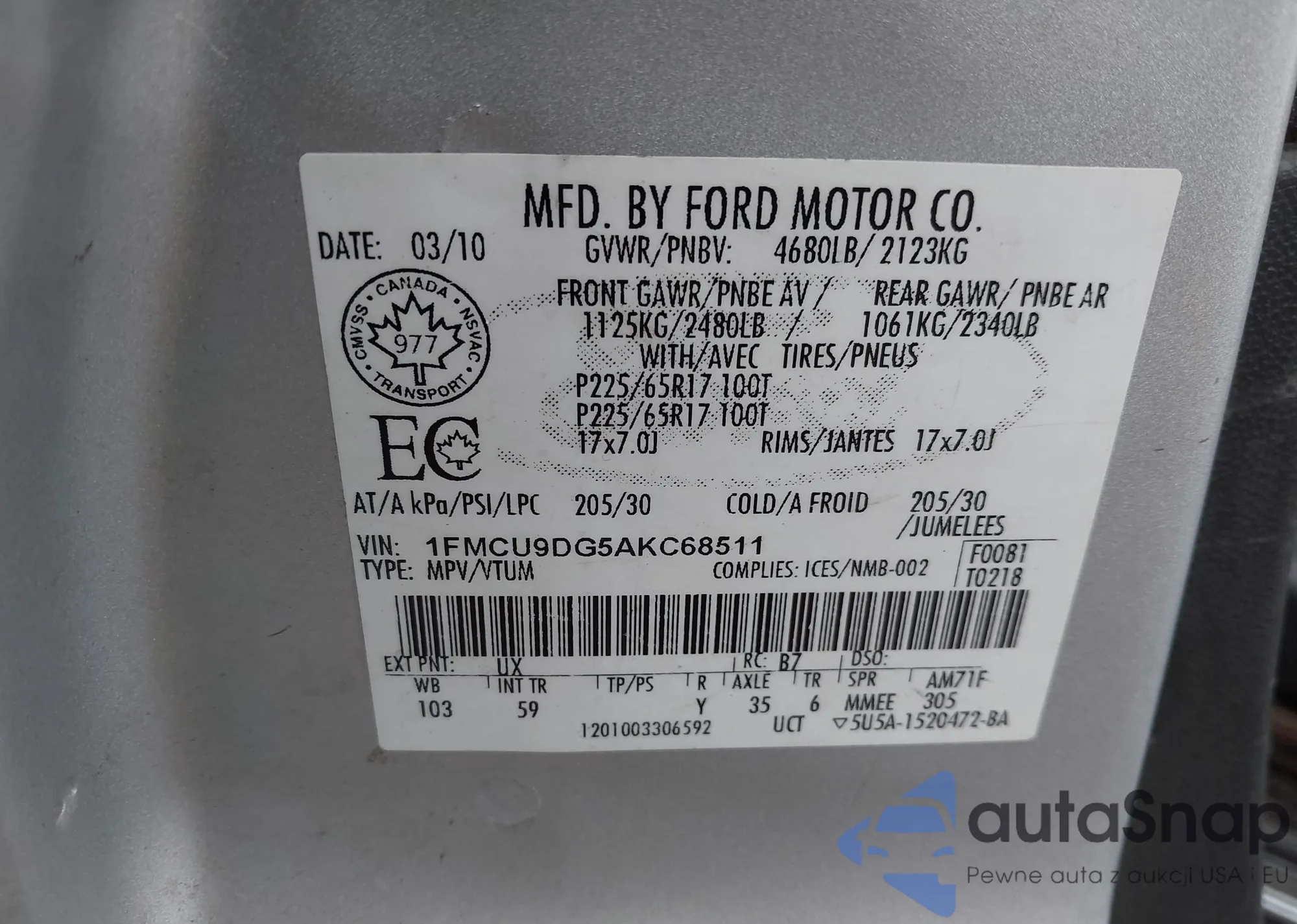 • VIN 1FMCU9DG5AKC68511