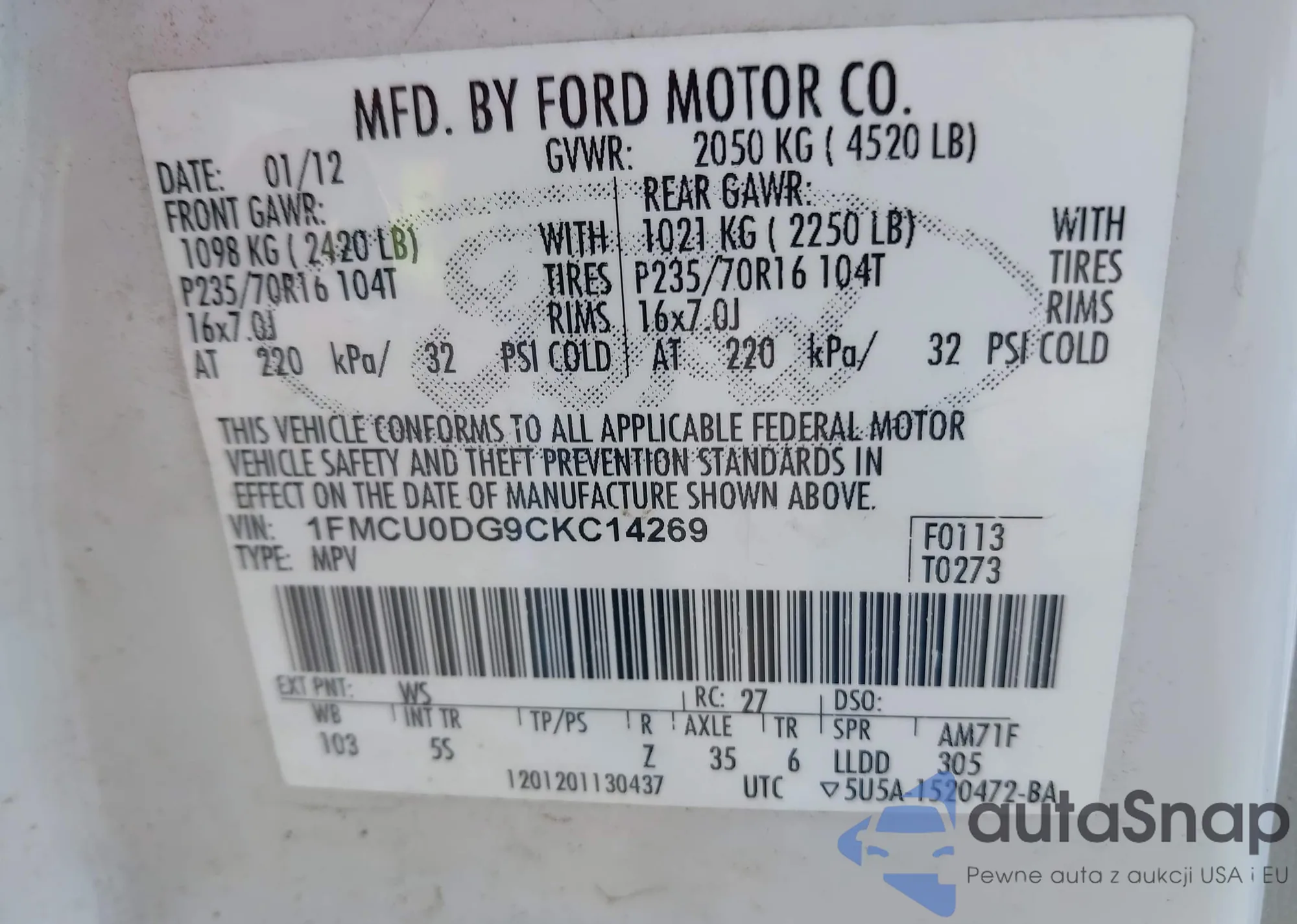 • VIN 1FMCU0DG9CKC14269