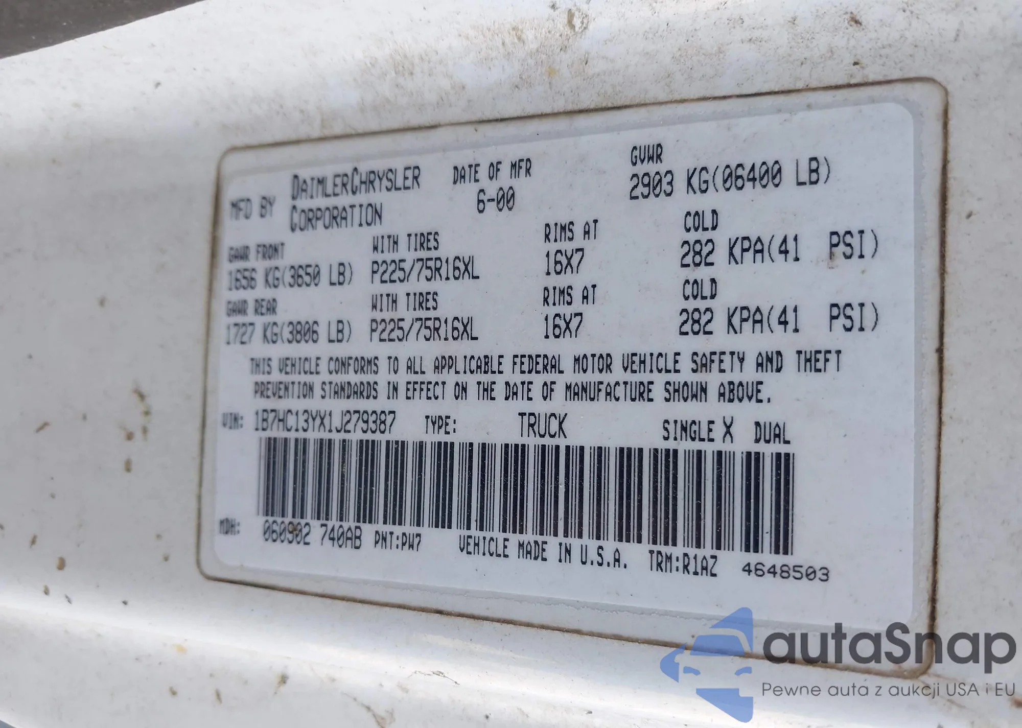 LOT: 42308286 VIN: 1B7HC13YX1J279387