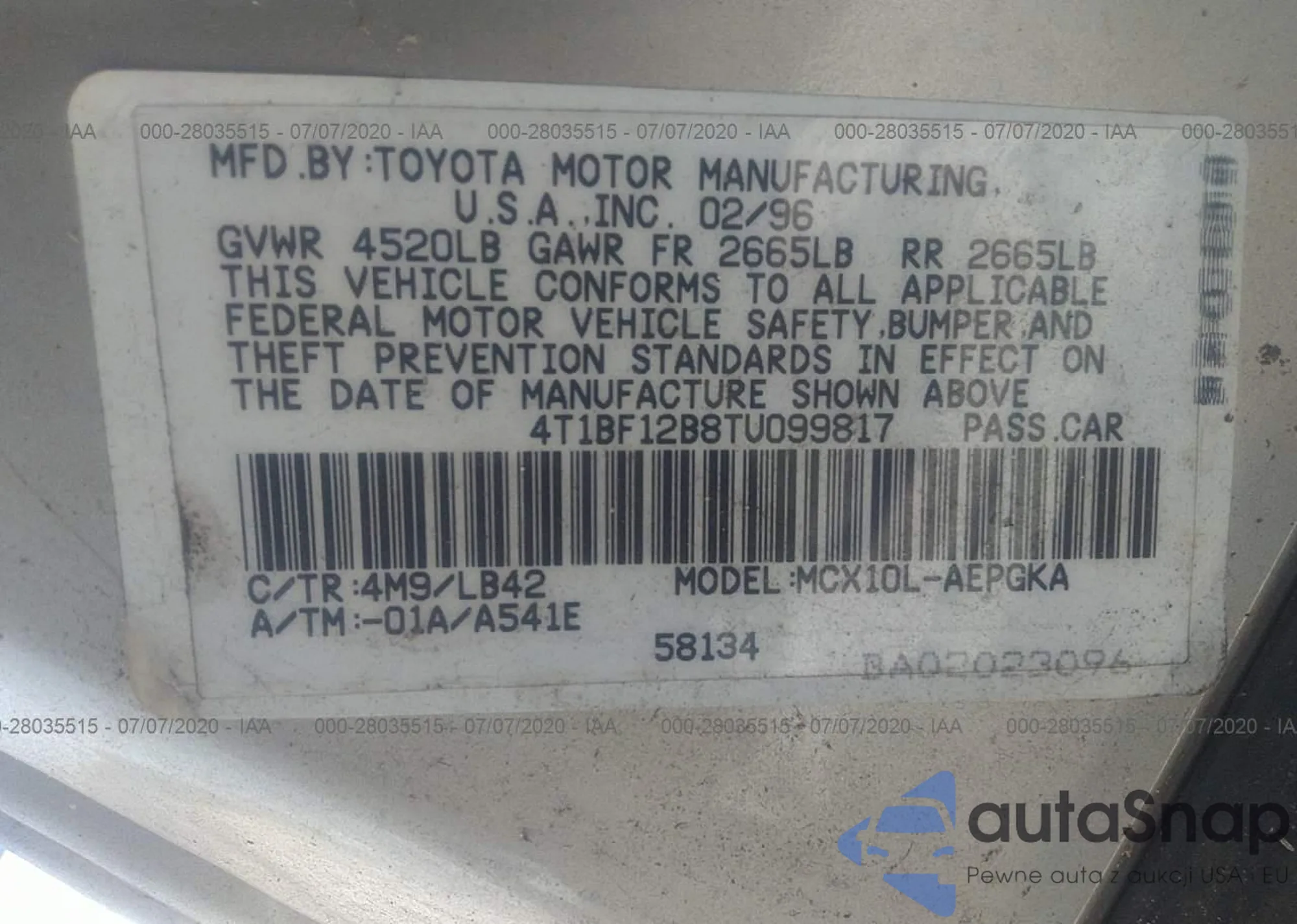 LOT: 41281453 VIN: 4T1BF12B8TU099817