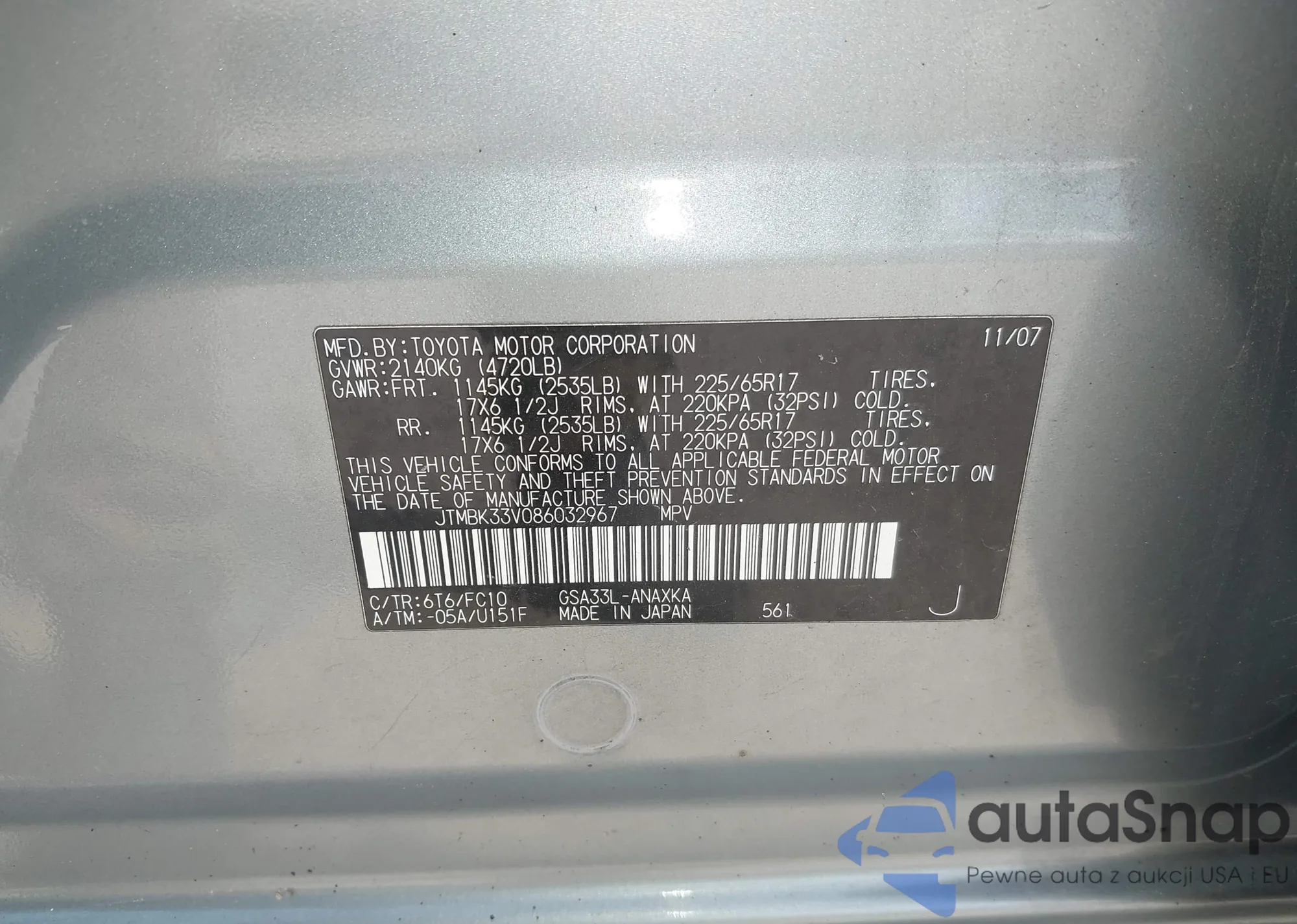 LOT: 42192729 VIN: JTMBK33V086032967