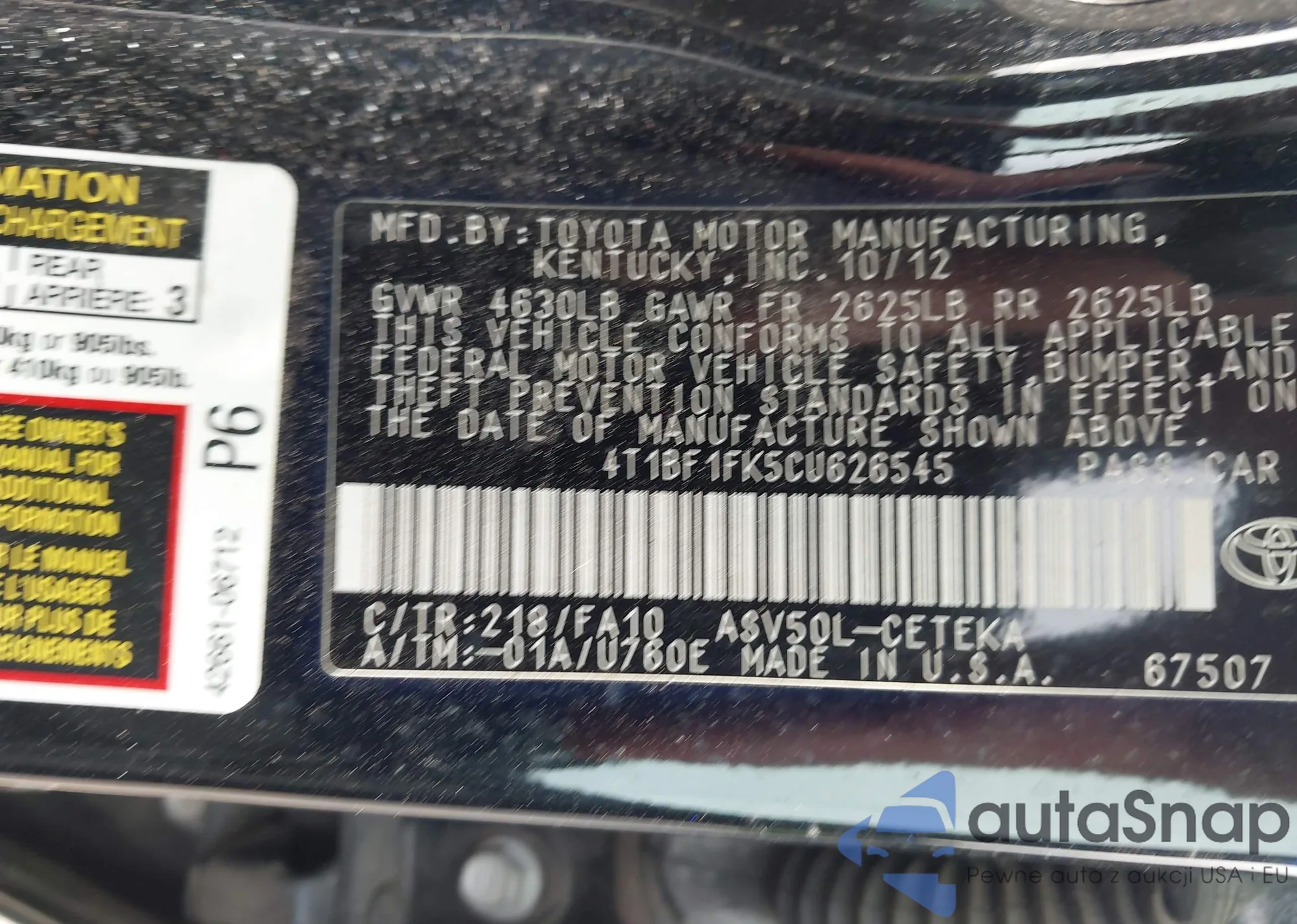 • VIN 4T1BF1FK5CU626545