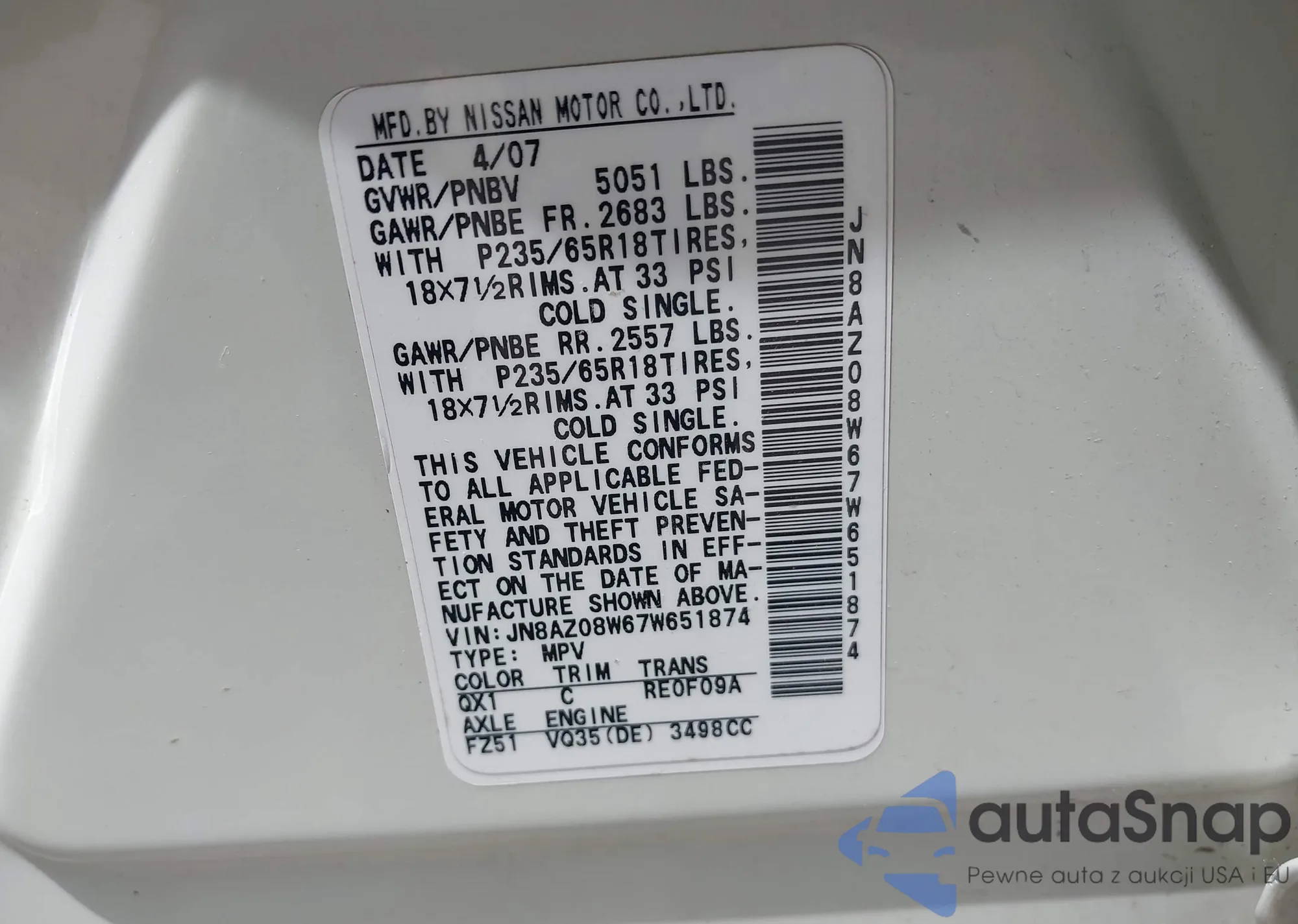 • VIN JN8AZ08W67W651874