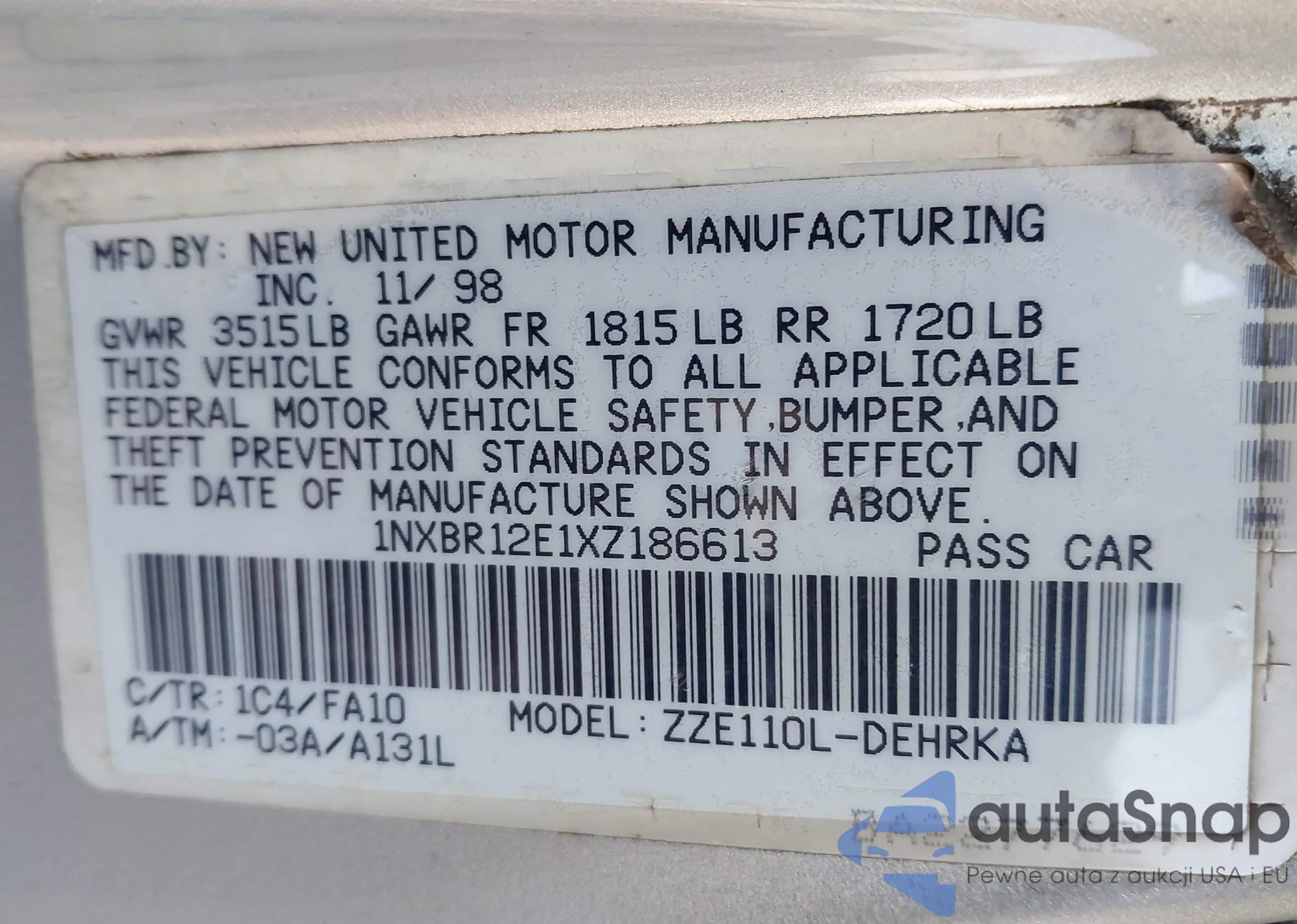 • VIN 1NXBR12E1XZ186613
